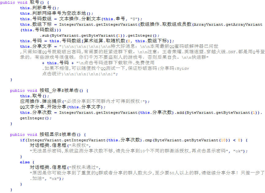 我们在一些APP中发现,要求用户必须分享到自己的QQ群才能使用软件功能并且对分享的QQ群数量和QQ群里的人数有明确要求,分享文字内包含了不法分子预先设置的QQ群号,诱导其他用户加群下载APP。