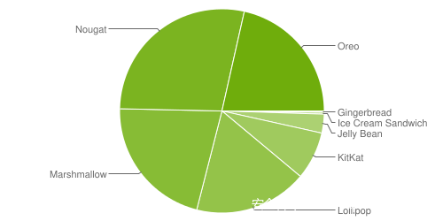 - 截止2018年10月,Google发布的Android系统版本分布统计,Android Nougat(Android 7.0/7.1)达到28.2%,占比第二的是Android Oreo(Android 8.0/8.1)总占比已达21.5%,而最新系统版本Android 9 Pie不足0.1%。