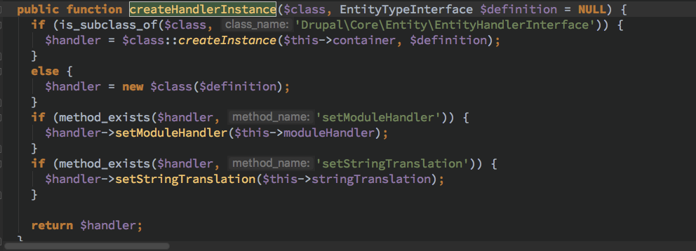 而且进一步观察到 $this->handlers[$handler_type][$entity_type] 这个值在调用 getHandler 的时候如果没有被 set 那么就会通过如上过程完成初始化
