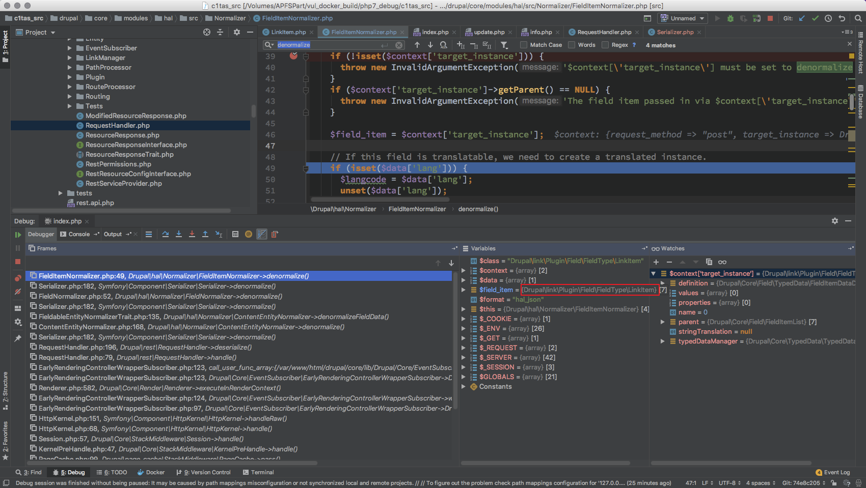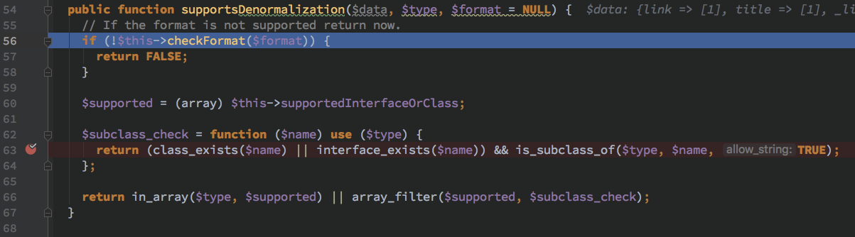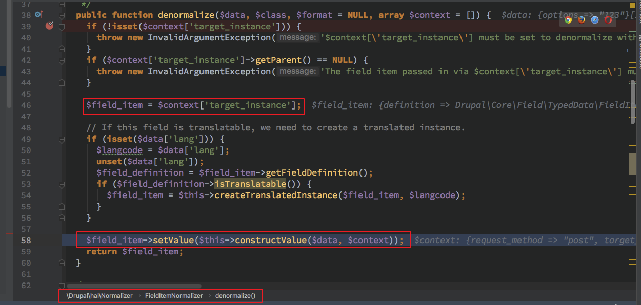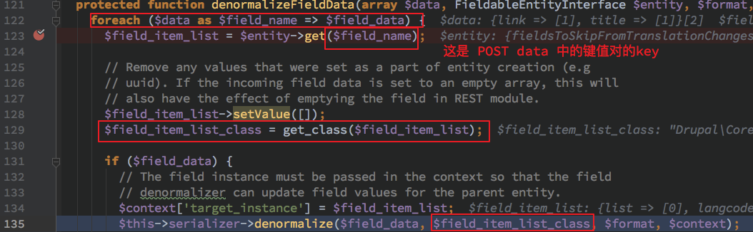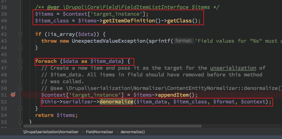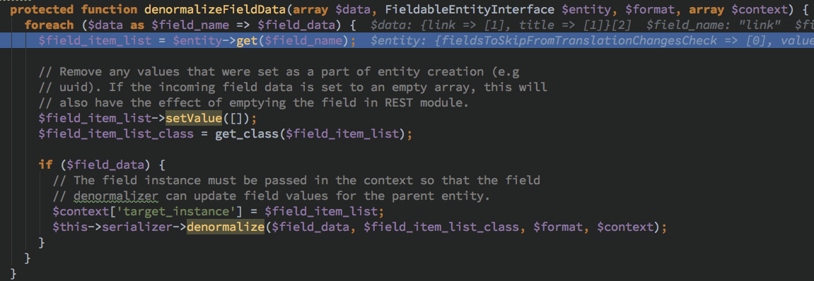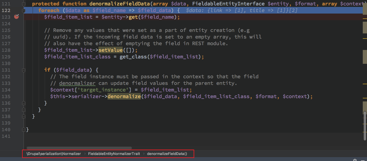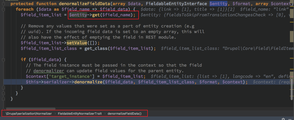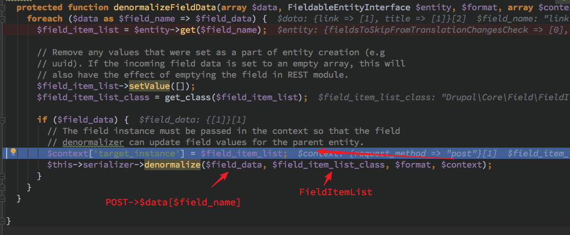 因为 denormalizeFieldData 这个在 DrupalserializationNormalizer 中实现的方法应该是属于定义的接口函数,会根据不同是实例调用到对应实例的 Normalizer 的子 denormalize 处理函数。此处由函数名以及代码逻辑得知此处由 field 来决定