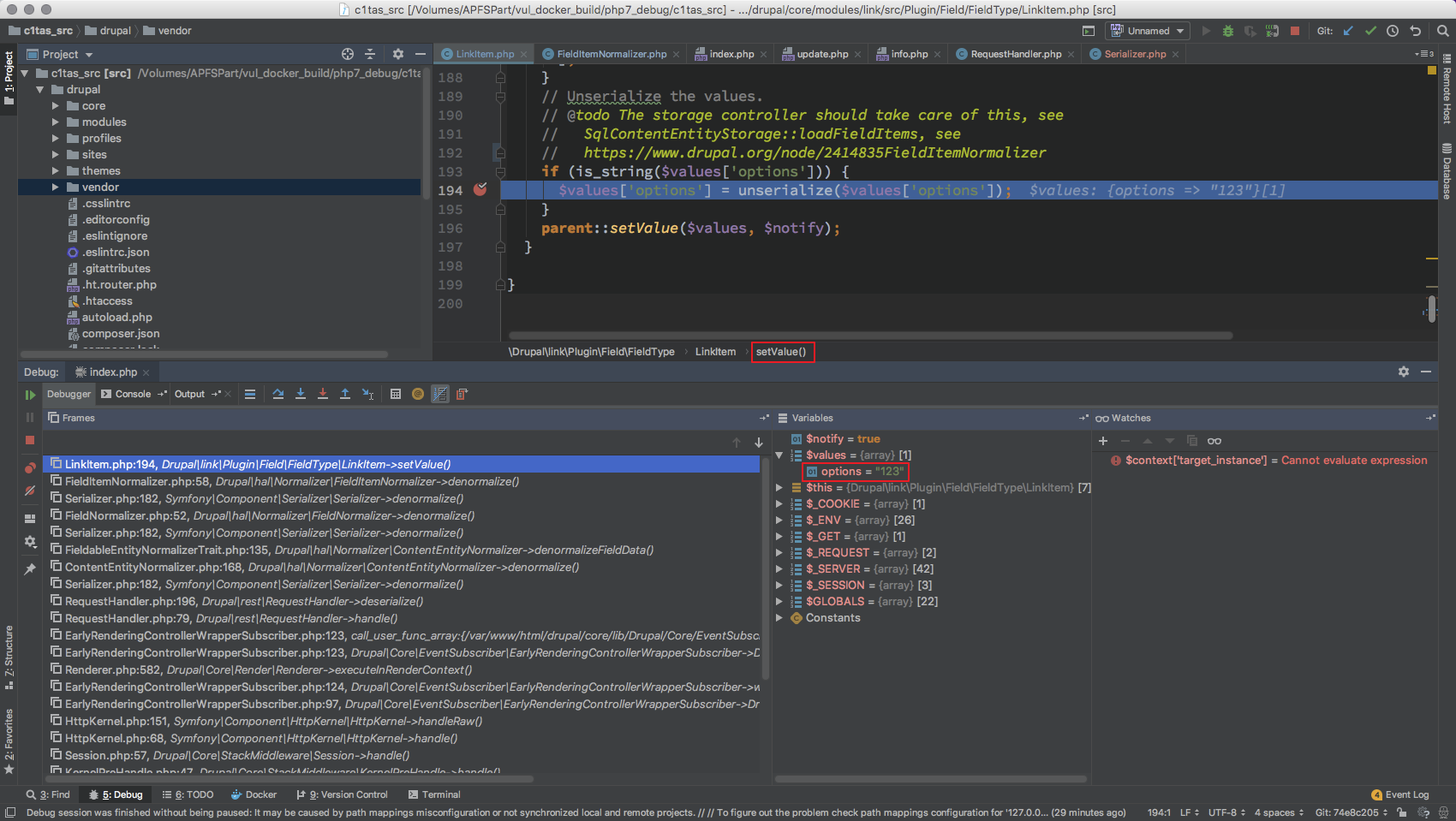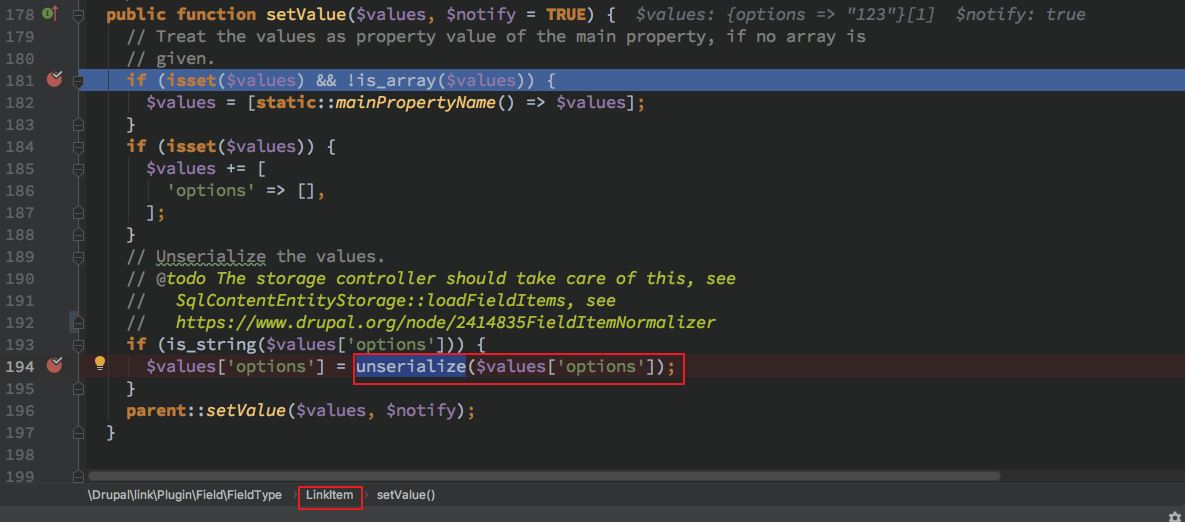 由于触发在 setValue 那么肯定是要去找对应的调用,而根据上文以及阅读的代码,drupal 封装自 symfony 而所有的方式基本都已用接口的方式实现,那么在这种设计模式下你是不可能直观的找到 LinkItem->setValue 这种简单的调用的。