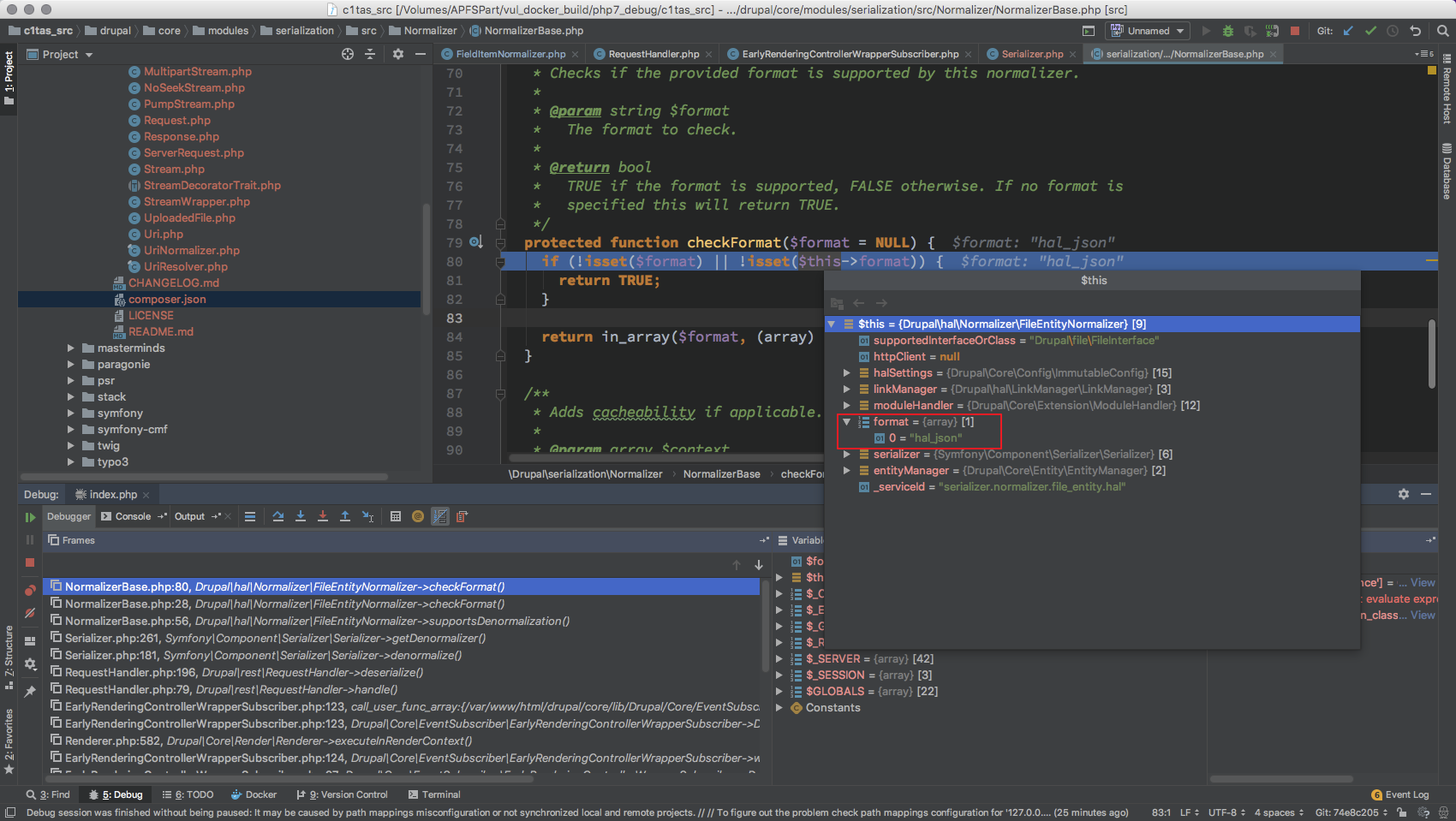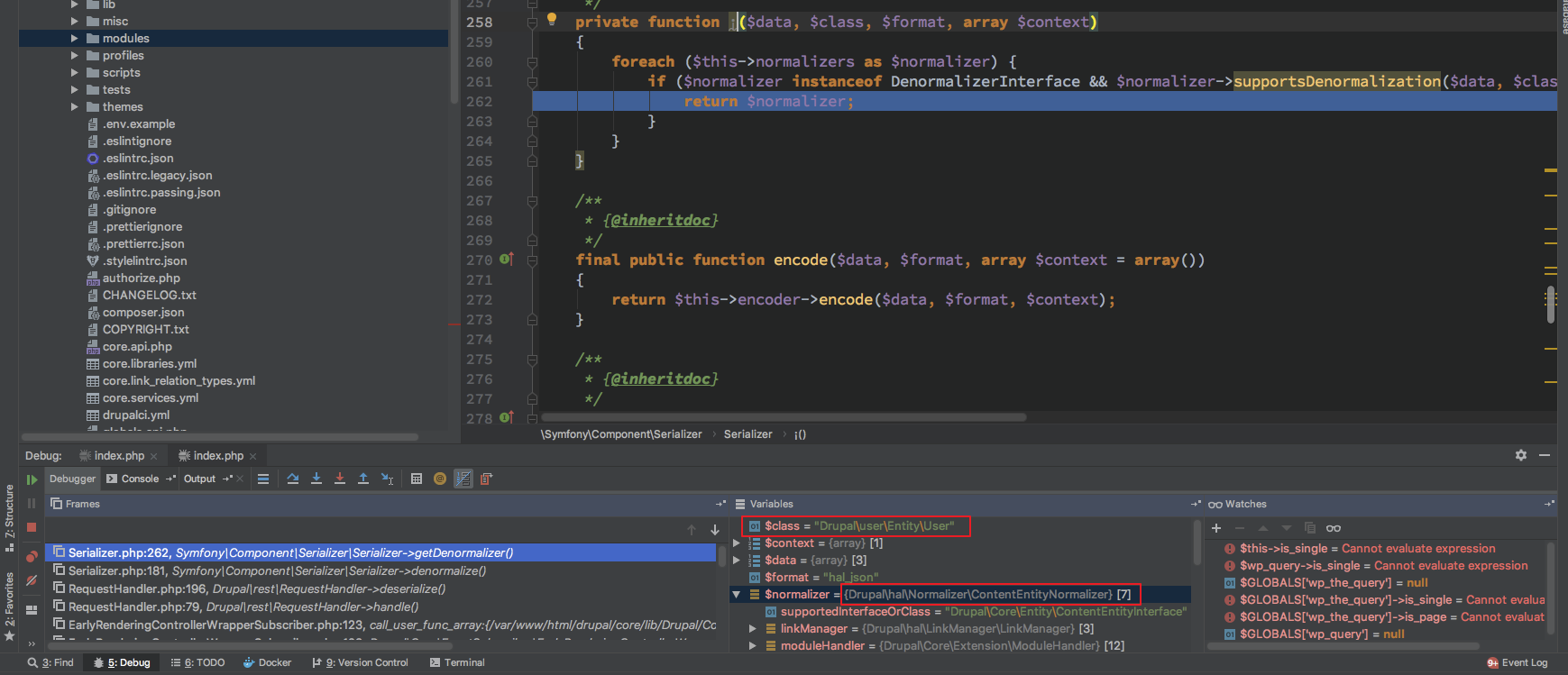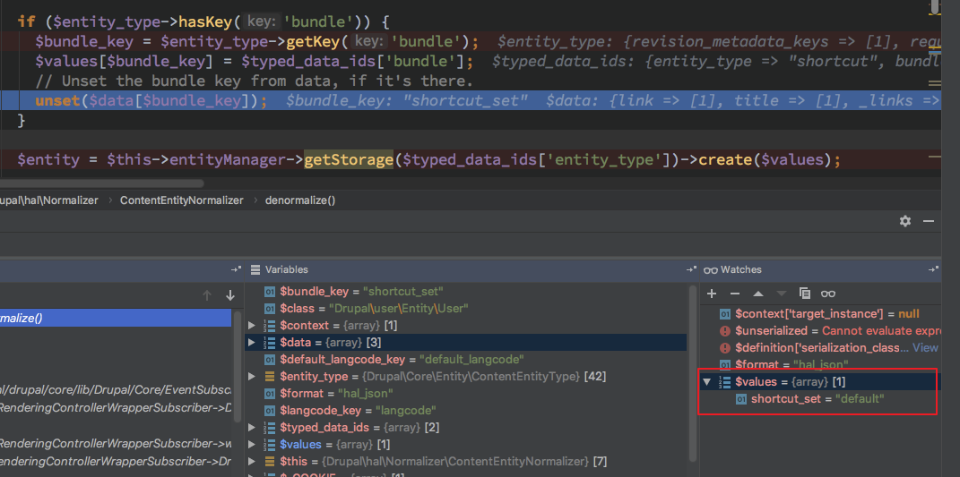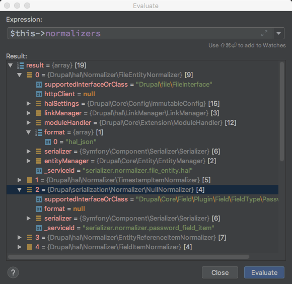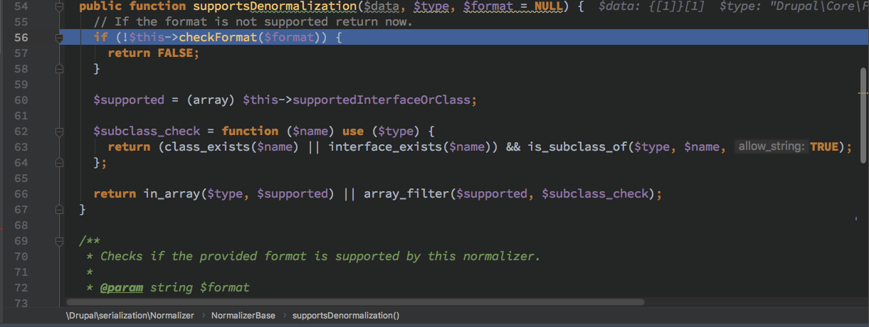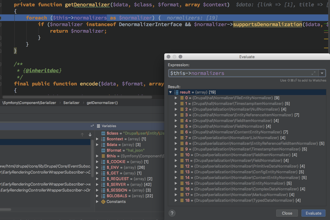 这里就出现了狼人情况, 这总共 18 个 Normalizer 而且是在 开启 HAL 情况下才会有 DrupalhalNormalizer* 其他的 Normalizer $format 全为 null 无法继续处理 对于 /DrupalhalNormalizer* 来说 $format 只有 hal_json ,从这里定下