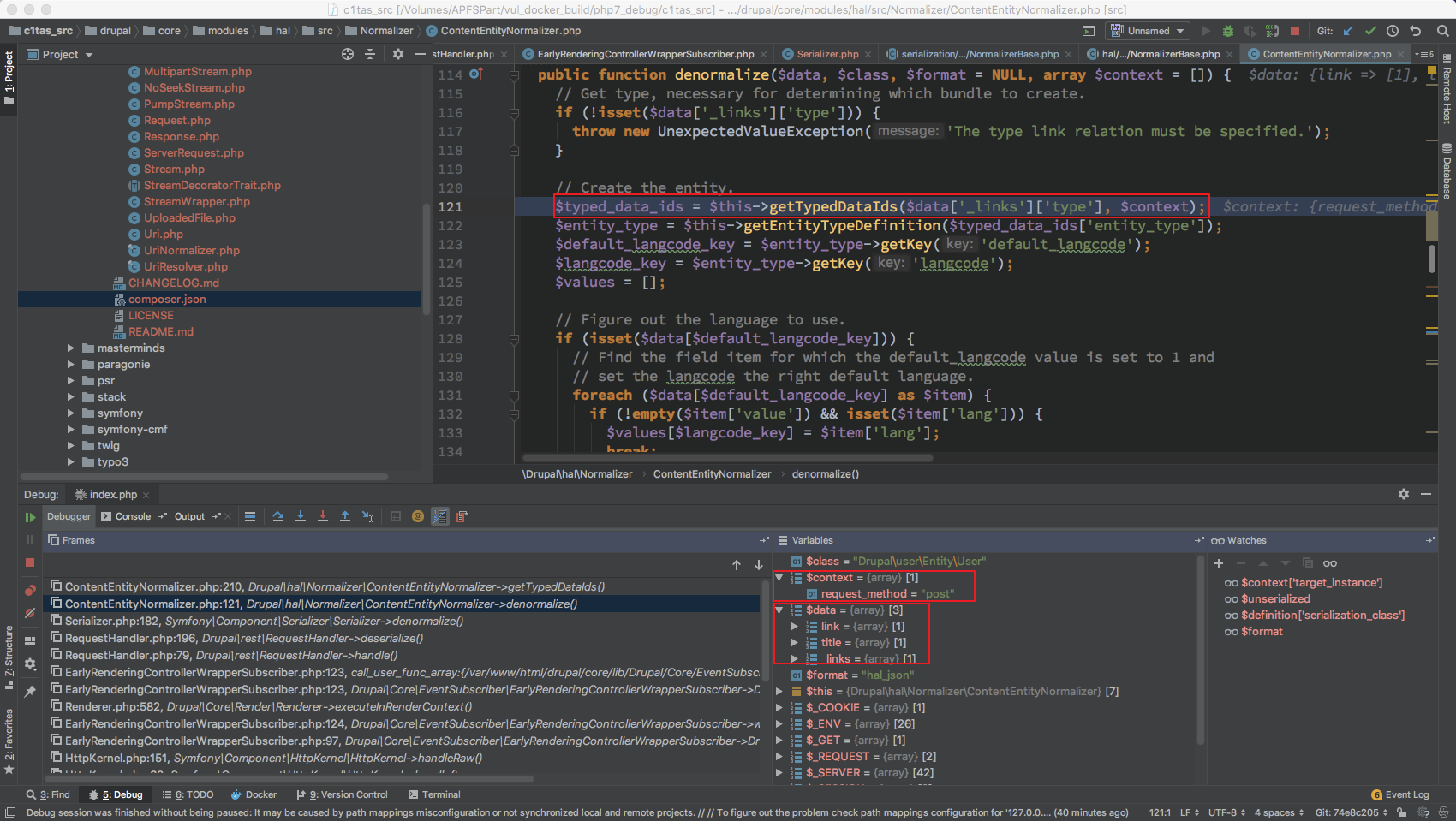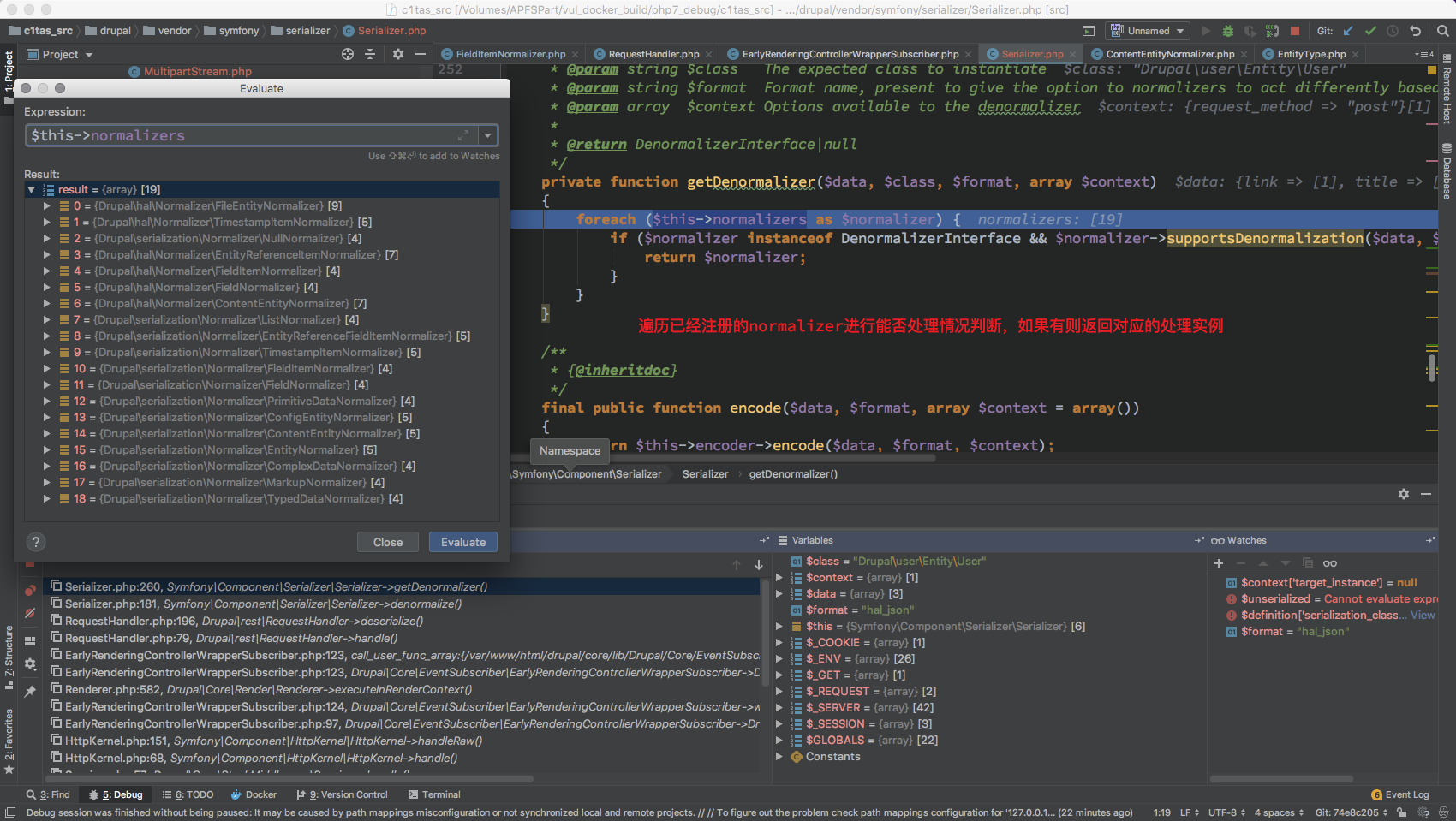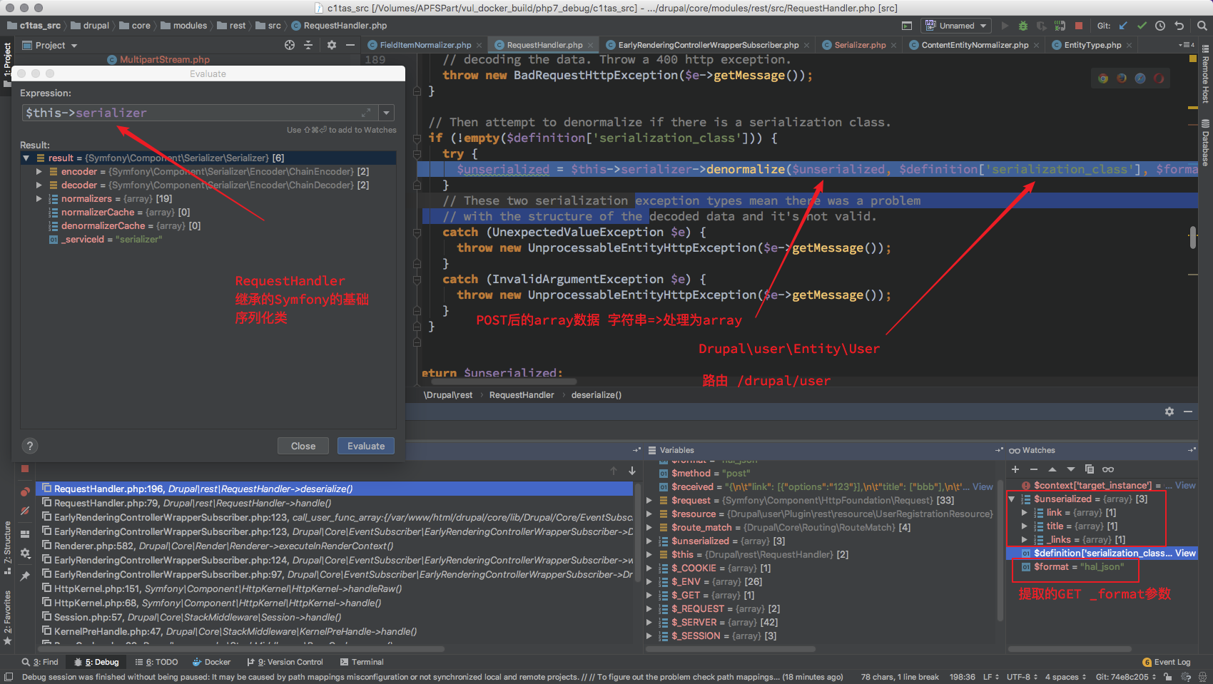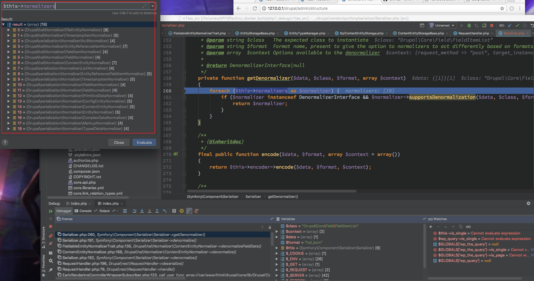 这里就出现了狼人情况, 这总共 18 个 Normalizer 而且是在 开启 HAL 情况下才会有 DrupalhalNormalizer* 其他的 Normalizer $format 全为 null 无法继续处理 对于 /DrupalhalNormalizer* 来说 $format 只有 hal_json ,从这里定下