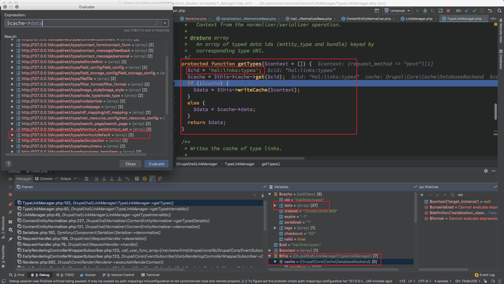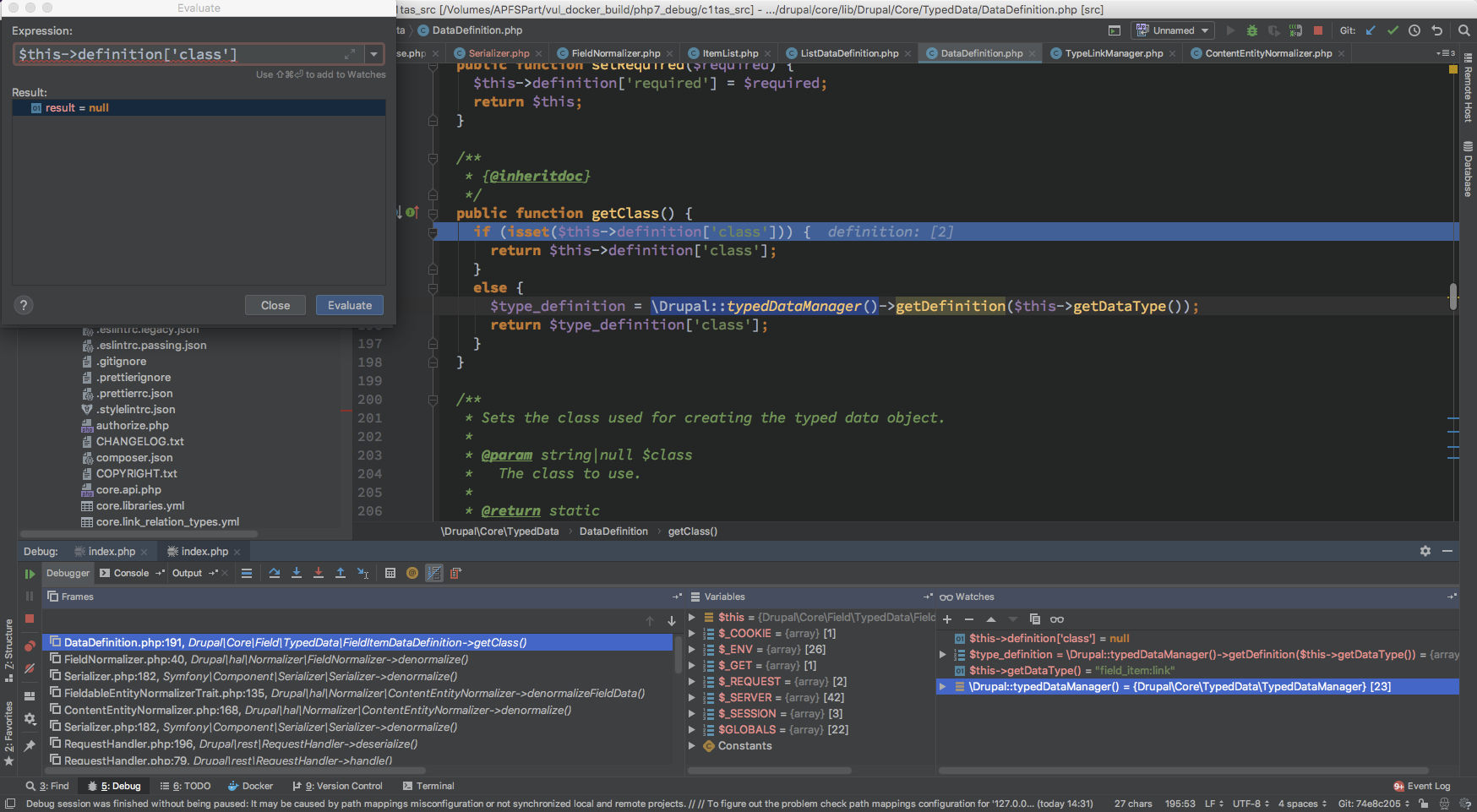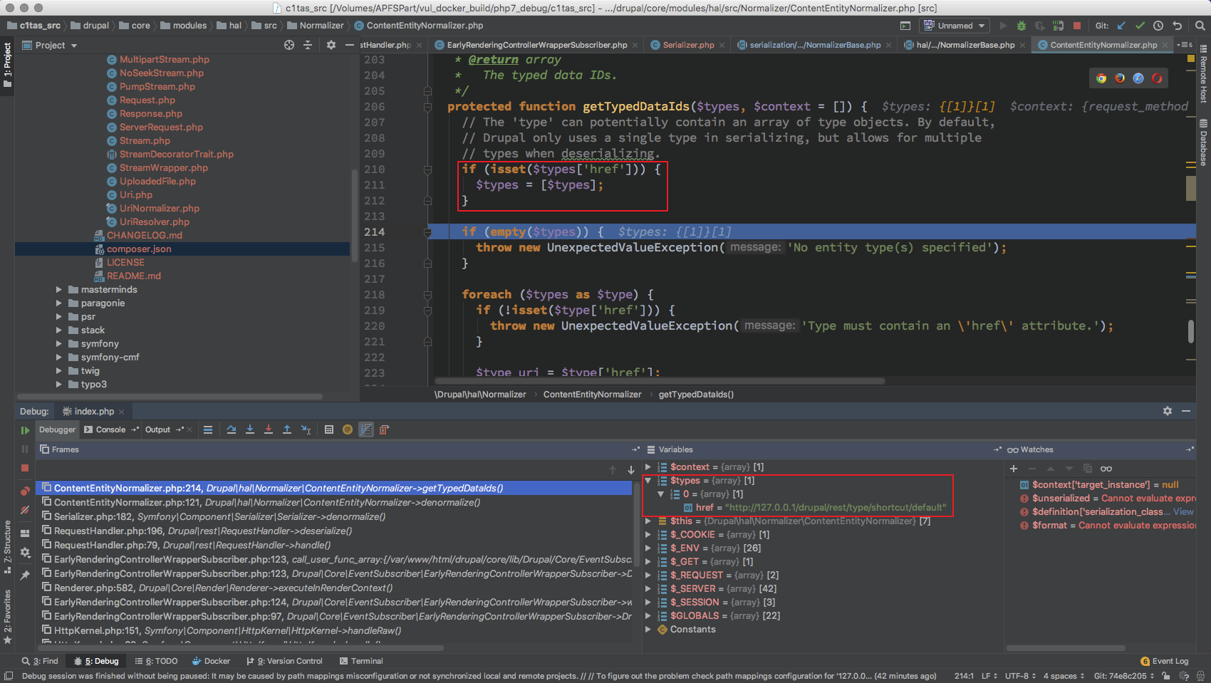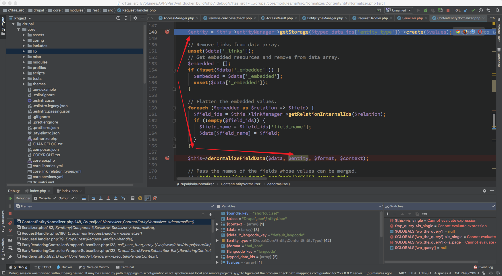 这里就出现了狼人情况, 这总共 18 个 Normalizer 而且是在 开启 HAL 情况下才会有 DrupalhalNormalizer* 其他的 Normalizer $format 全为 null 无法继续处理 对于 /DrupalhalNormalizer* 来说 $format 只有 hal_json ,从这里定下