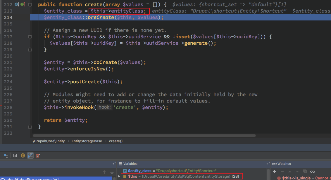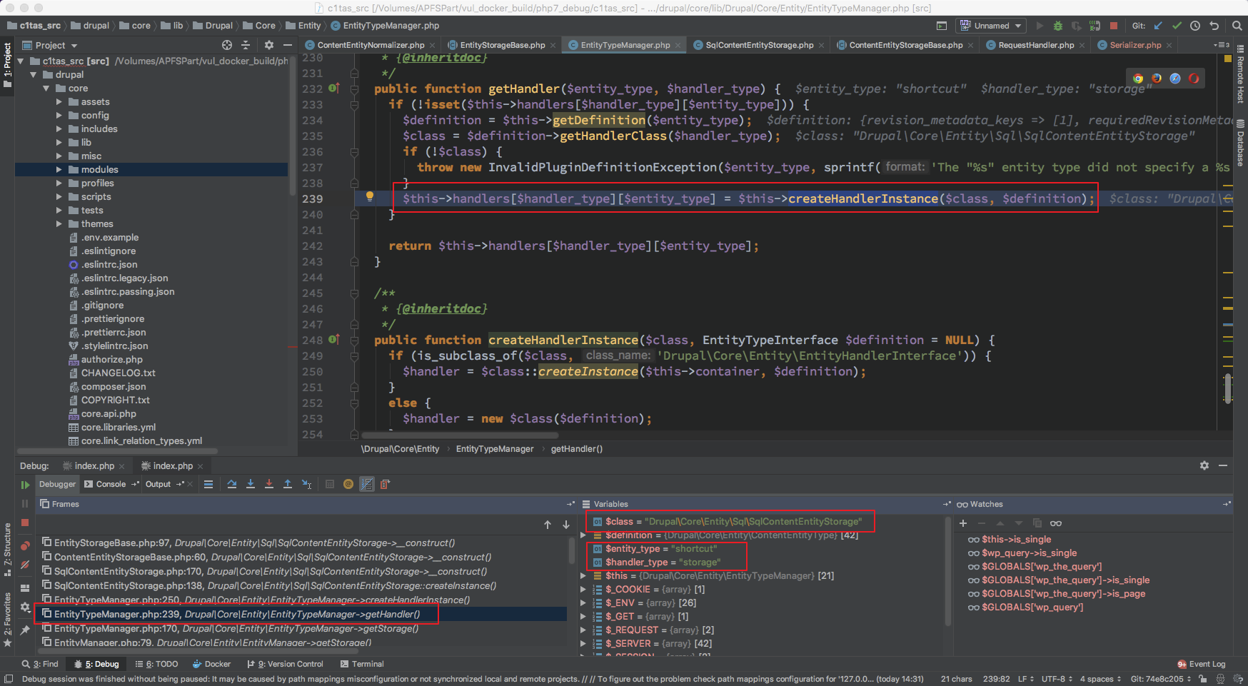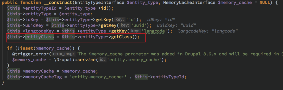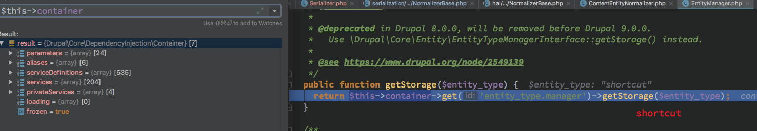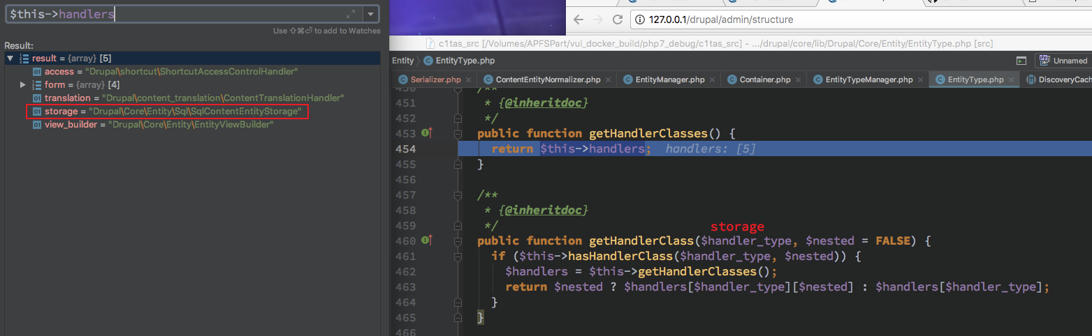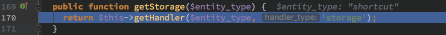 然后对此处断点,去回顾一下在 drupal 运行流程中什么时候会触发 EntityTypeManager 的 getHandler 初始化并且初始化的值分别是什么