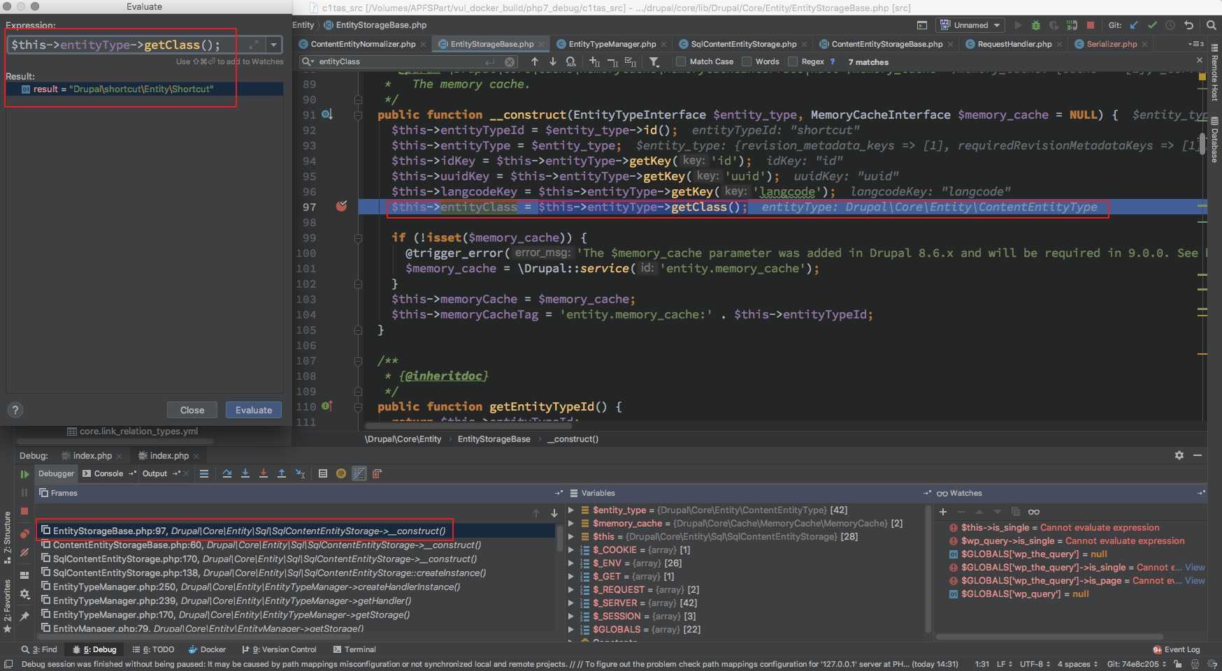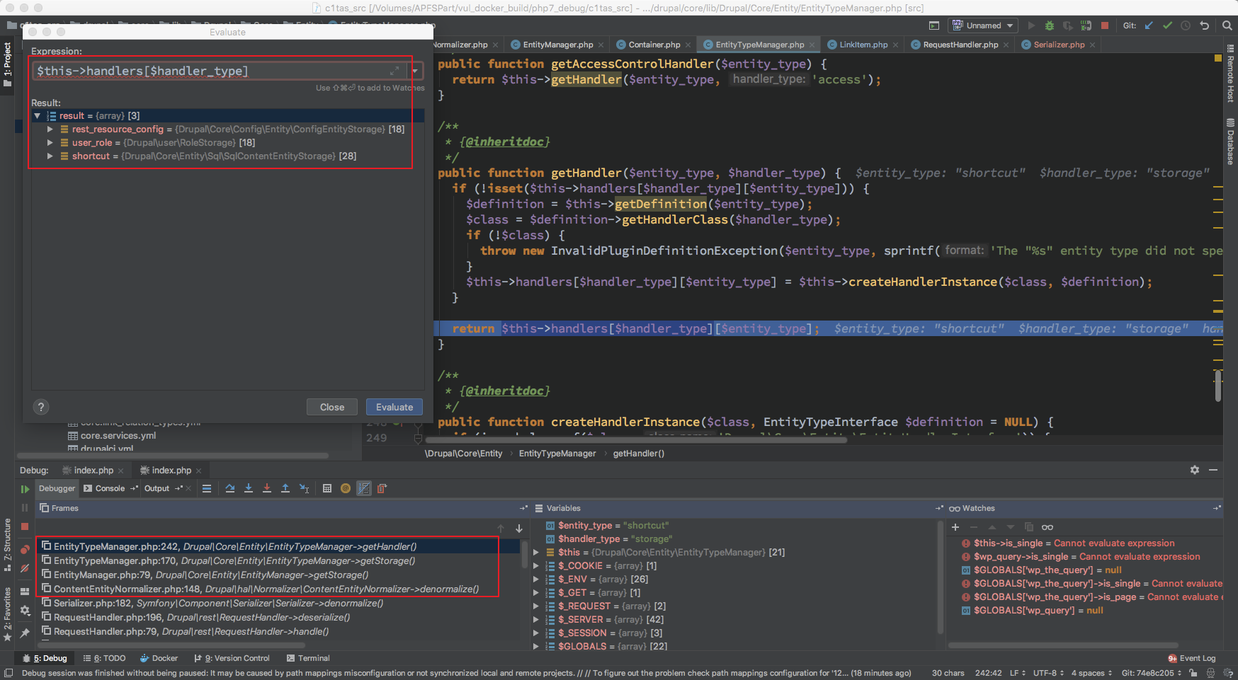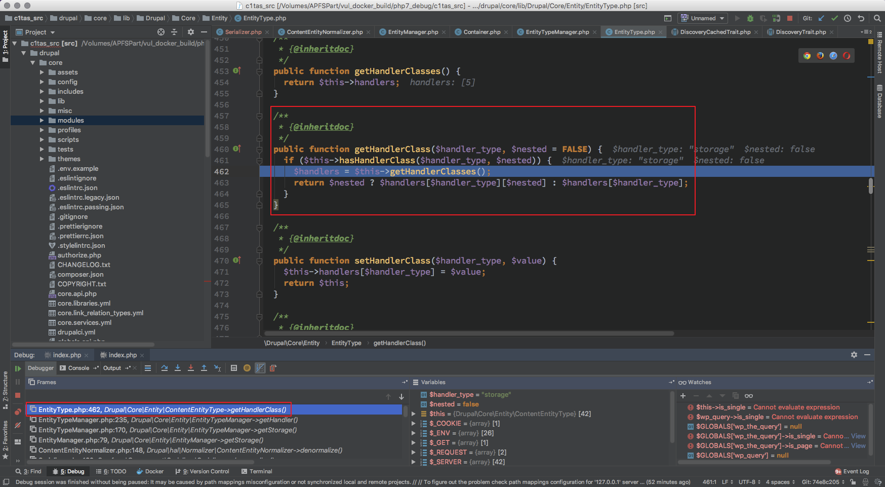 然后对此处断点,去回顾一下在 drupal 运行流程中什么时候会触发 EntityTypeManager 的 getHandler 初始化并且初始化的值分别是什么