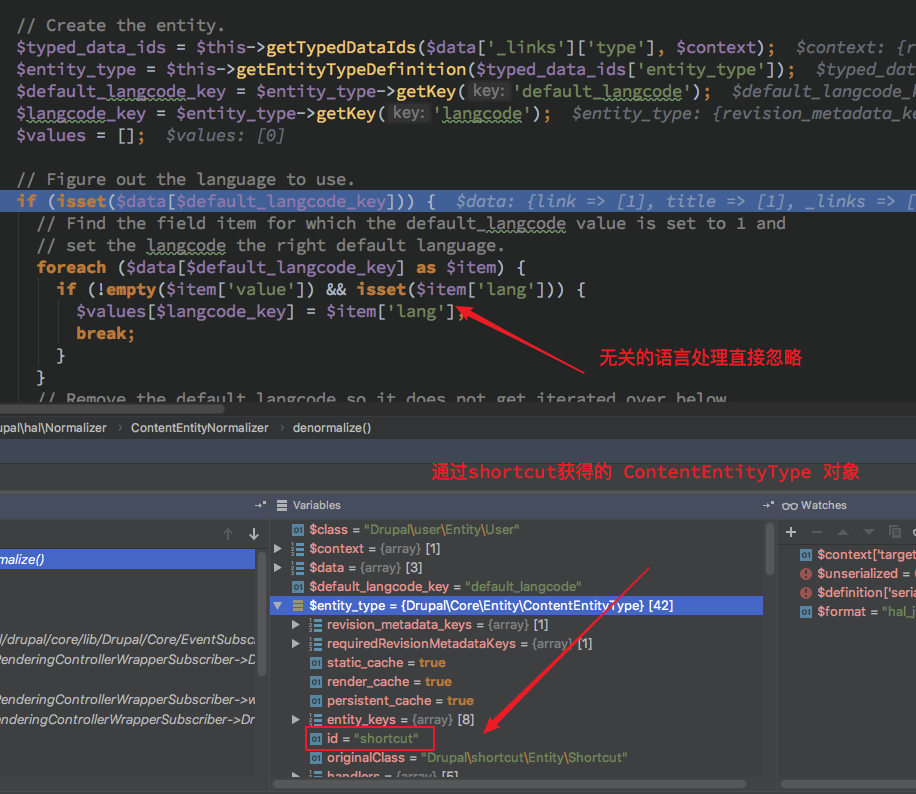 进行第二阶段 ContentEntityNormalizer 反序列化根据 POST 中传递的 _link->type 来决定处理的 entity, 关于 entity 的处理可以向下继续阅读