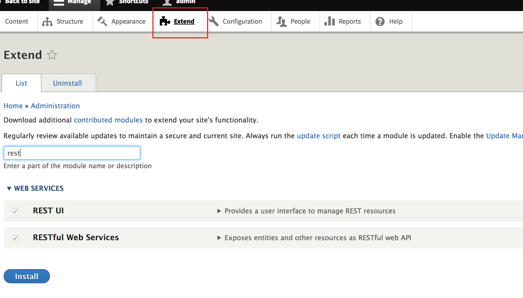 但其实你会发现你安装了 drupal 你却没有 restui 这个东西
