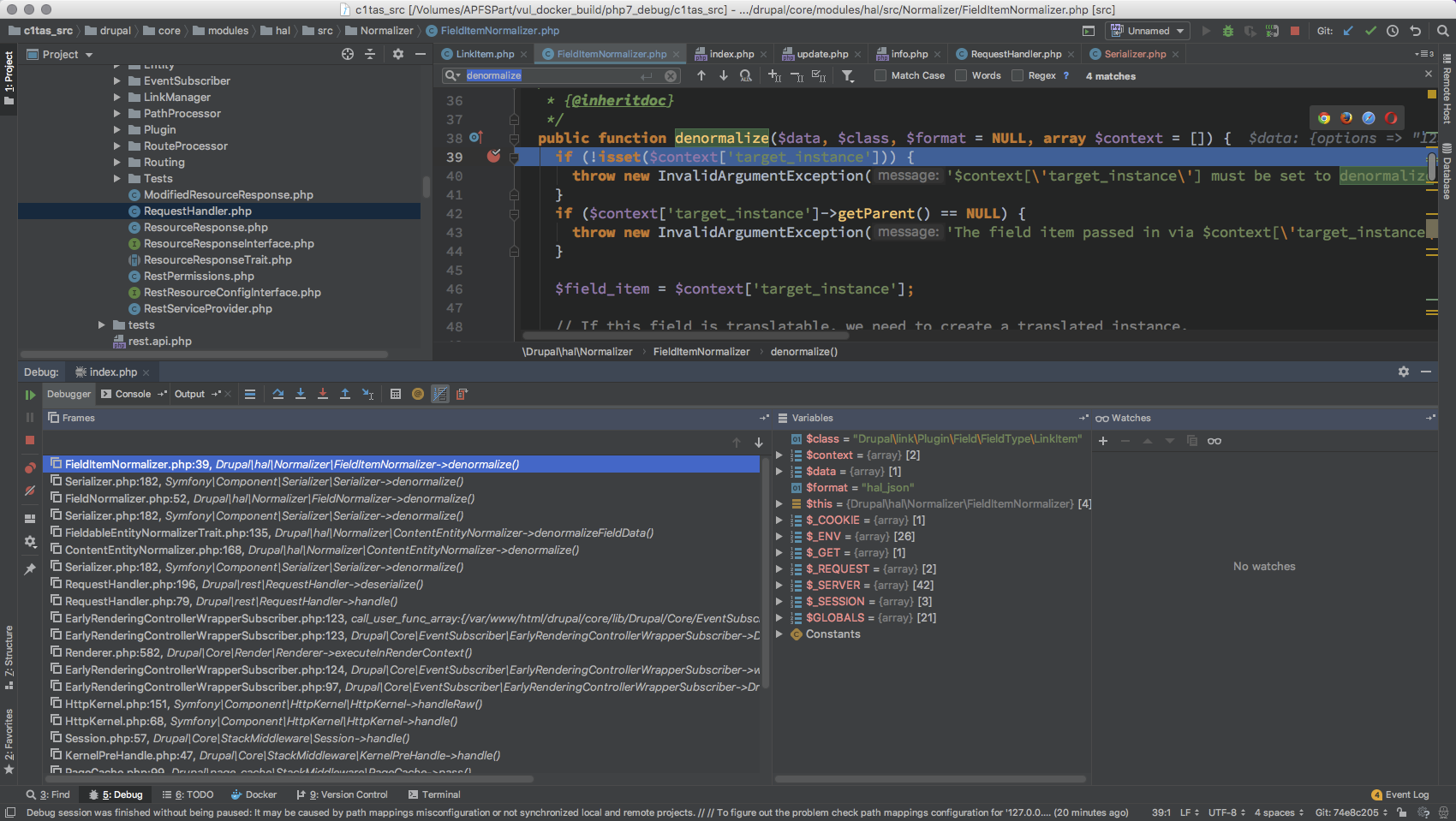 此处的 entity 就是刚才分析的 getStorage=>create 这个过程创建的 entity 实体,下面即有所需的 denormalize 调用。要调用到 FieldItemNormalizer 就需要满足