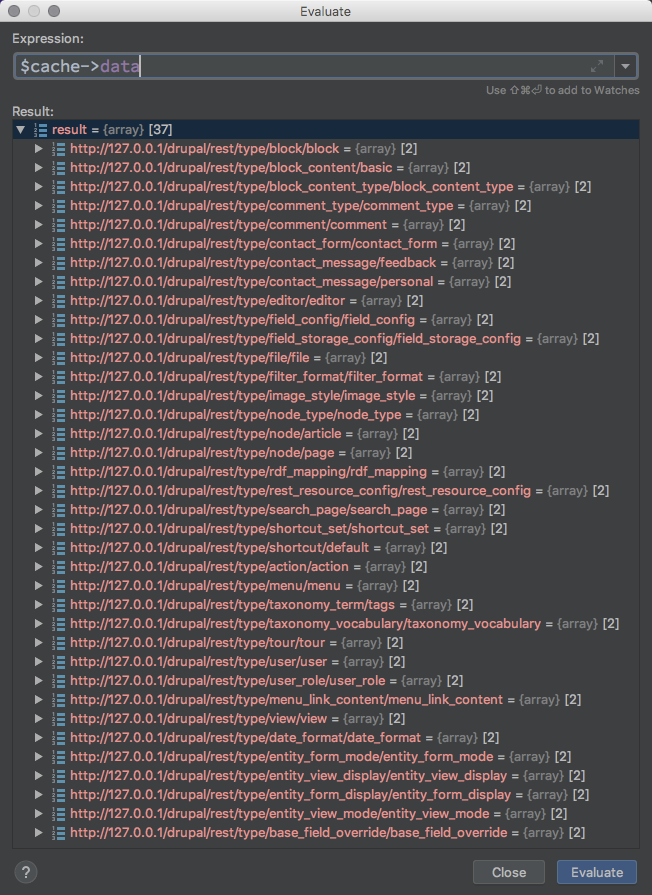 从 cache 中取 key 为 hal:links:types 的缓存 可以看到总共有 37 条缓存,这些缓存的对应关系都如下