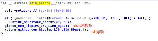 这里是攻击程序的入口(main_attack)主要有两个攻击模块,一个是ssh爆破,另一个式redis未授权攻击,与上一个版本一样。