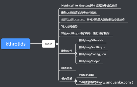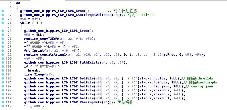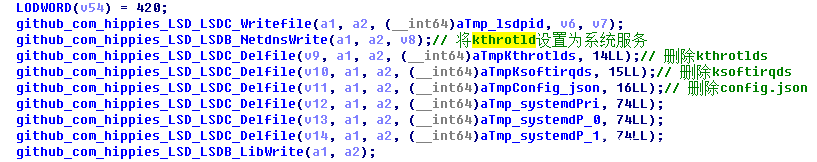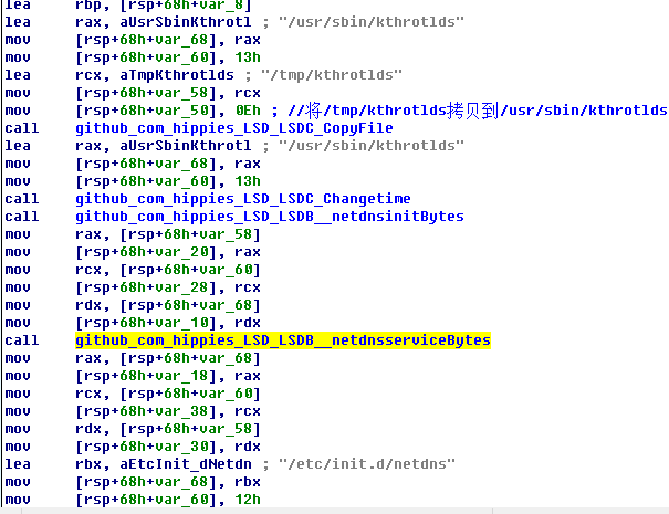 下面是将kthrotlds通过github_com_hippies_LSD_LSDC_CopyFile函数将/tmp/kthrotlds拷贝到/usr/sbin/kthrotlds中。然后往/etc/init.d/中写入一个名叫netdns的文件,并通过chkconfig命令将netdns添加为开启启动项。