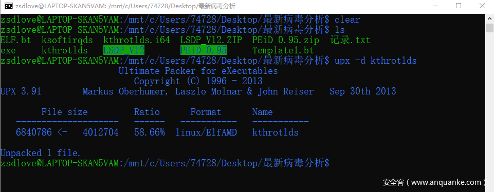 1、相对于之前的watchdogs,其加壳方案并没有什么太大的改变,只是对于病毒程序的加固方面进行了一些修改,即将原本的upx壳的magic number改为了:4c 53 44 21。那么相应的应对措施就是,在脱壳之前,将其复原为55 50 58 21。