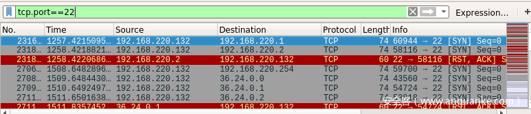 测试机上通过wireshark抓取到的ssh爆破行为: