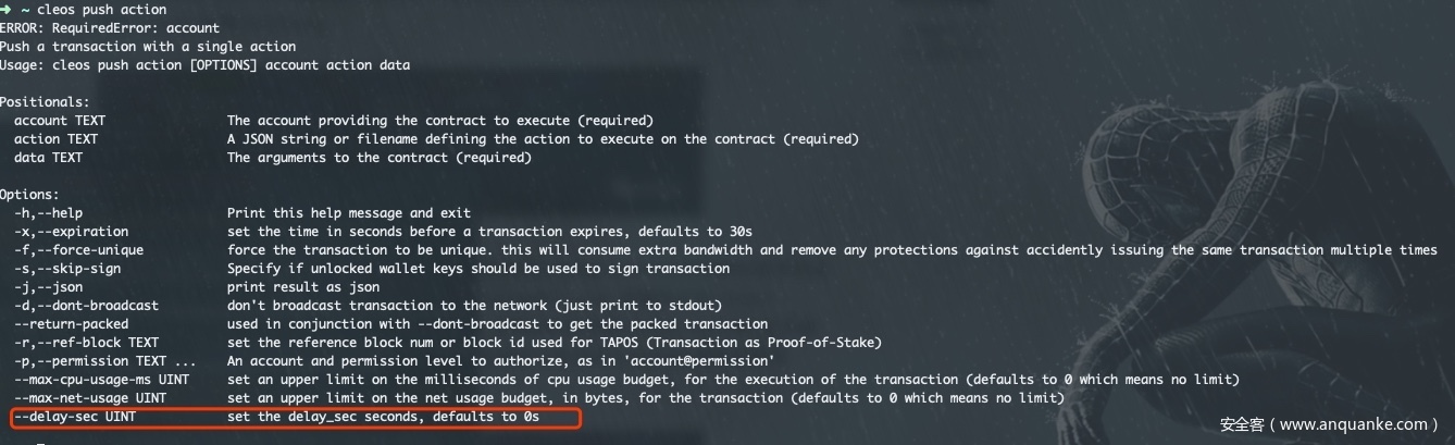 此次的攻击手法就是利用了上述状态中的 hard_fail 状态进行攻击,在以前的开发过程中,许多开发者都不曾碰到过这种交易执行状态,常规的区块浏览器上也无法查询到相关的交易,造成了开发者缺少对这种交易状态的认知。开发中的惯常思维也是只有合约才能发起延时交易。但是,通过 cleos 中的具体参数配置 delay-sec 参数: