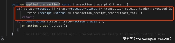 A:无法保证,不同的节点 history plugin 插件的实现方式不一,不排除节点提供方自己修改 history plugin 实现,导致查询到的交易存在除 exectued 及 soft_fail 外的其他状态。