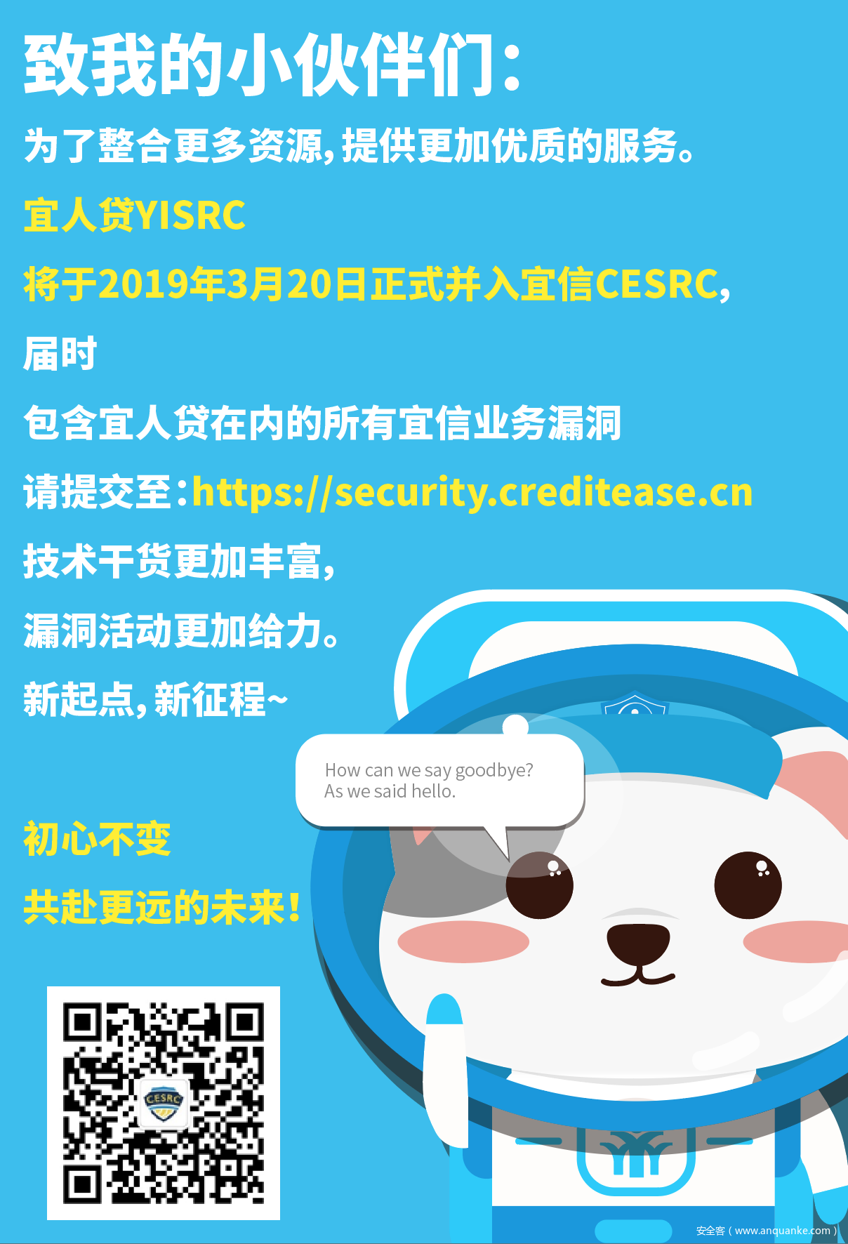 技术干货更加丰富!漏洞活动更加给力!新起点,新征程;初心不变 ,共赴更远的未来!感谢大家一直以来的关注和支持!原宜人贷YISRC存有可用积分的白帽表哥将于2019年3月20日后台转入宜信CESRC(账户及积分一并转入);