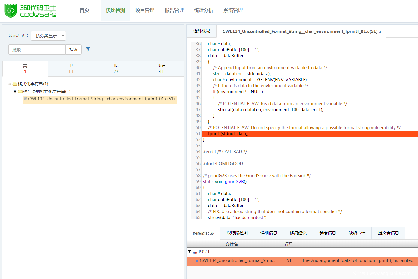 使用360代码卫士对上述示例代码进行检测,可以检出“被污染的格式化字符串”缺陷,显示等级为“高”。如图1所示: