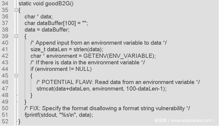在上述修复代码中,Samate 给出的修复方式为: 在第51行对 fprtinf() 函数的格式说明符进行了明确定义,从而避免了被污染的格式化字符串。