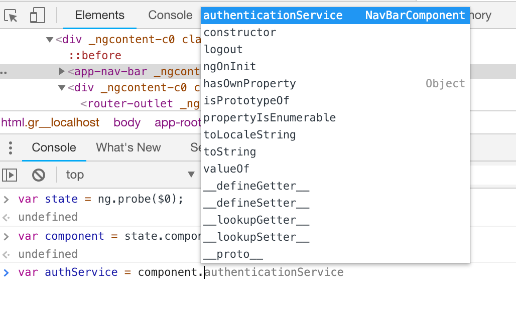 现在我们已经打开了控制台选项卡,让我们获取感兴趣的服务。在这种情况下,我们对AuthService感兴趣。我们可以打开浏览器控制台并执行以下操作: