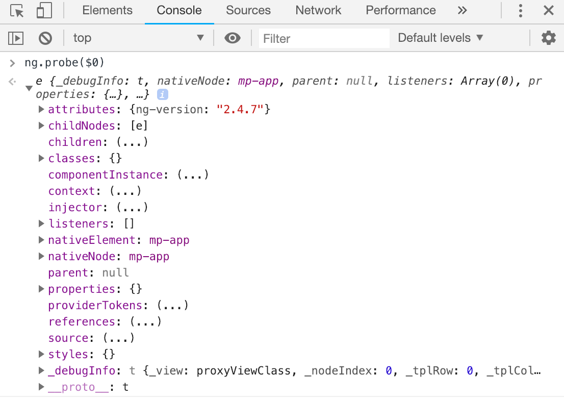 好吧,但是Angular2 +怎么样?有什么奇特的动态调试技巧吗?Angular2 +应用程序不像Angular1.x那样容易使用浏览器控制台操作。大多数Angular 2应用程序都是在生产模式下加载到浏览器中的(当然,除非开发团队意外地在开发模式下部署了该应用程序),这限制了我们可以做的事情和功能调试。