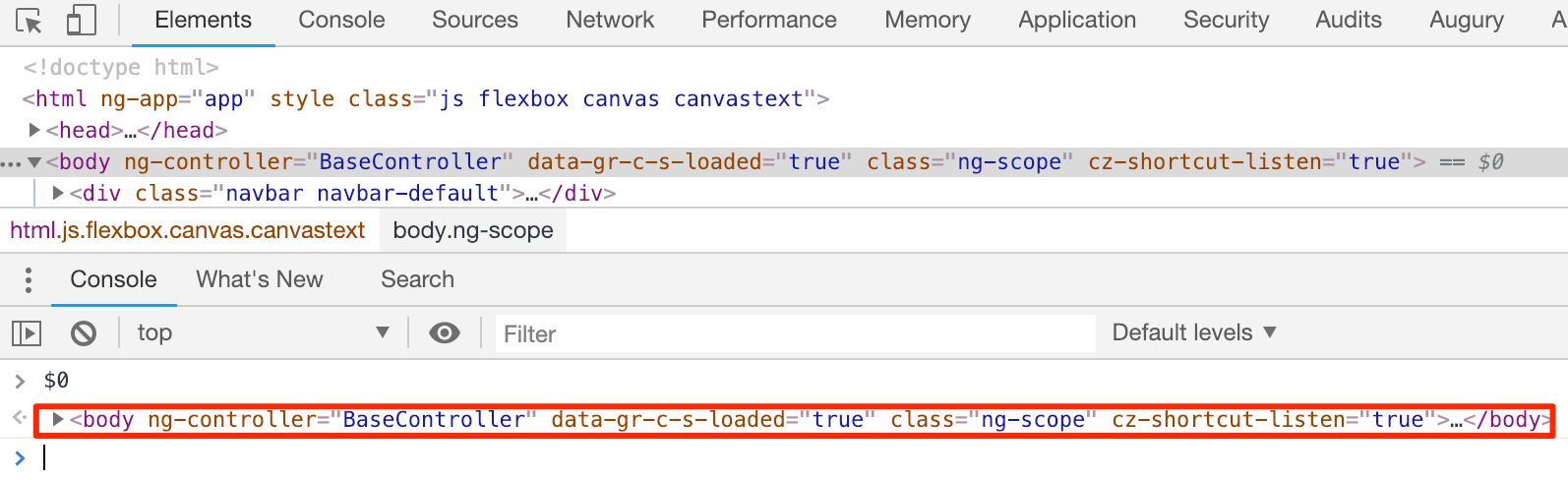 如果我们想改变范围变量呢?你可以通过获取对包含要操作的范围变量的控制器的引用来实现这一点。第一步是获取对该控制器管理的页面上元素的引用。最简单的方法是使用开发人员工具控制台的“elements”选项卡选择该元素,并在控制台中键入$ 0,这将返回该DOM对象。我们将使用这种技术来获取控制器参考。例如,请注意下图中我们选择由BaseController控制的 <body>元素。键入$ 0后,我们看到控制台中打印了DOM元素。