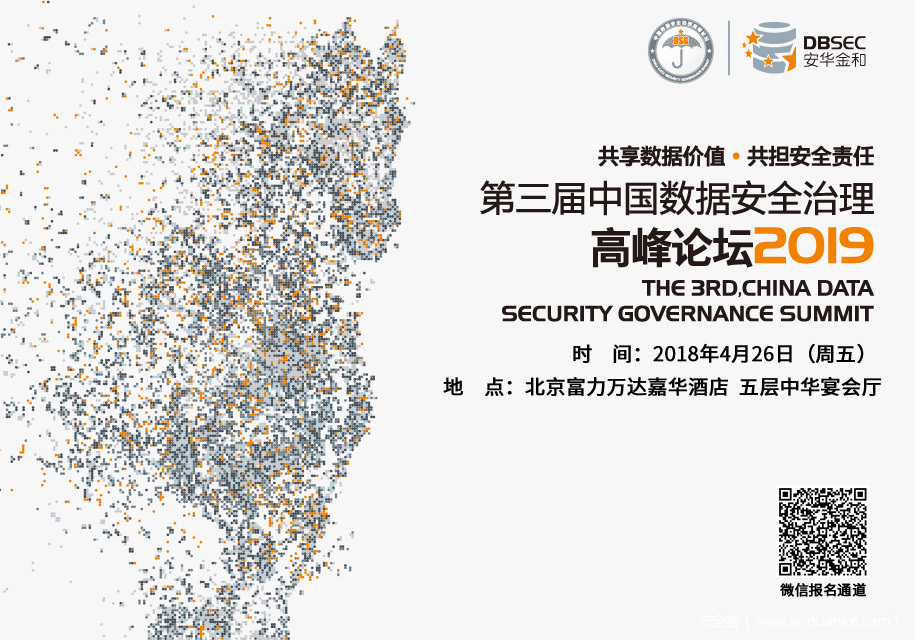 第三届中国数据安全治理高峰论坛将于 2019 年 4 月 26 日在北京富力万达嘉华酒店召开。中国数据安全治理高峰论坛在此之前已经成功举办两届,本届峰会以“共享数据价值·共担安全责任”为主题,在公安部、工信部、国家密码管理局、北京市网信办领导的支持参与下,广邀中央部委、地方政府、金融、能源、教育、医疗、互联网等企事业单位 CIO 及信息安全负责人千余人,共同描绘数据安全治理未来,共商产业引导、产业发展、技术发展。