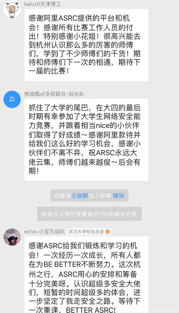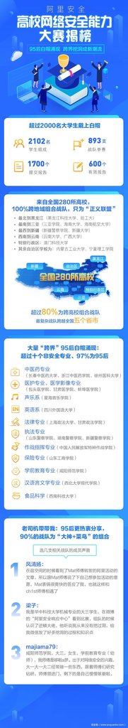 2018年12月3日-2019年2月22日,由阿里安全、阿里数据安全研究院、阿里安全响应中心ASRC共同举办的第一届大学生网络安全能力大赛召开。吸引全国近280多所高校的2102名学生组成893支战队参赛。提交报告超过1700个,有效报告600余个,新增白帽子超过150人。数据安全考试共计1365人参加考试,通过率30%。