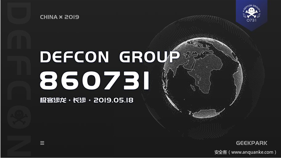 Defcon Group 860731将于2019年5月18号在长沙举办,延续Defcon的传统,将有干货满满的议题演讲和技术展示,为了让极客精神继续传播,让志同道合者更好的交流和沟通,我们广泛征集议题,欢迎大家投稿!