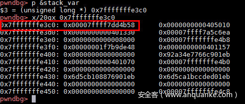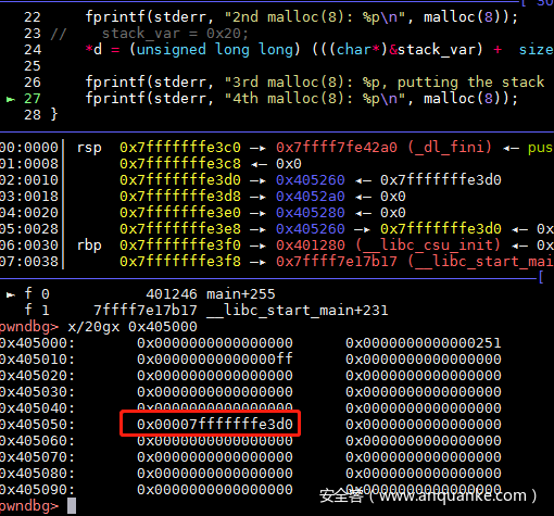*d = (unsigned long long) (((char*)&stack_var) + sizeof(d)); //2.26版本之后这里是+,2.25版本是-,因为stack_var变量是伪造chunk的size字段,2.26中fd指向的是另一个chunk的fd,所以是size字段+8,而2.25是指向chunk头,所以是size字段-8