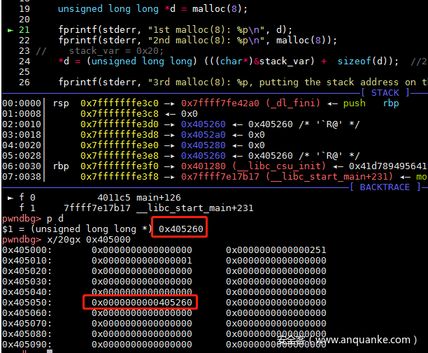 申请过d之后,0x405260还在tcache中,用户使用内存就是chunk的从fd开始的,因此直接修改*d的值即可