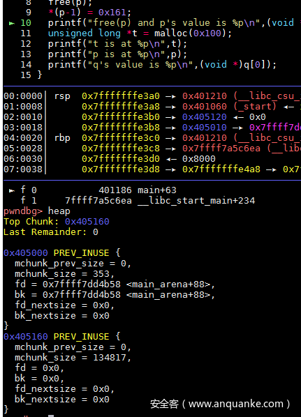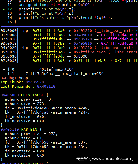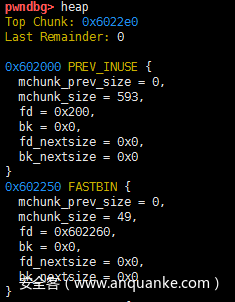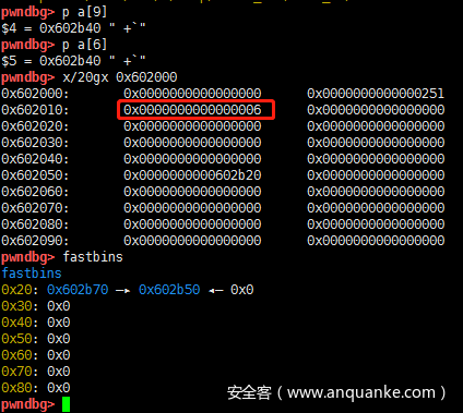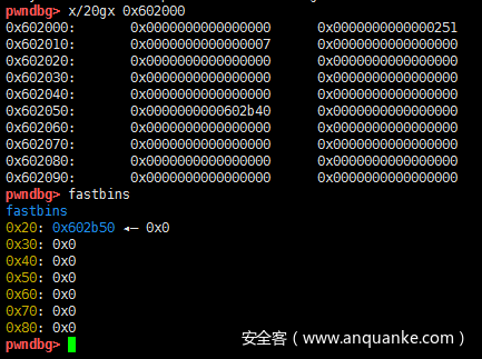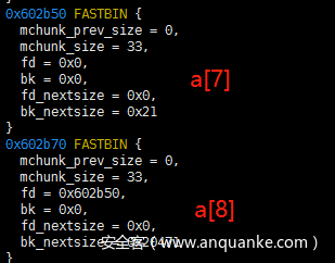 申请a[0]~a[8]一共9个chunk,依次释放,会发现前7个在tcache中,后两个会在fastbin上。