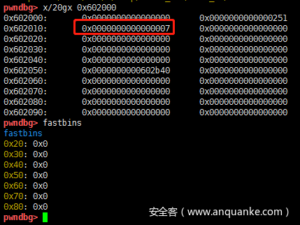 查看tcache,现在链表长度是7,fastbins中没有chunk