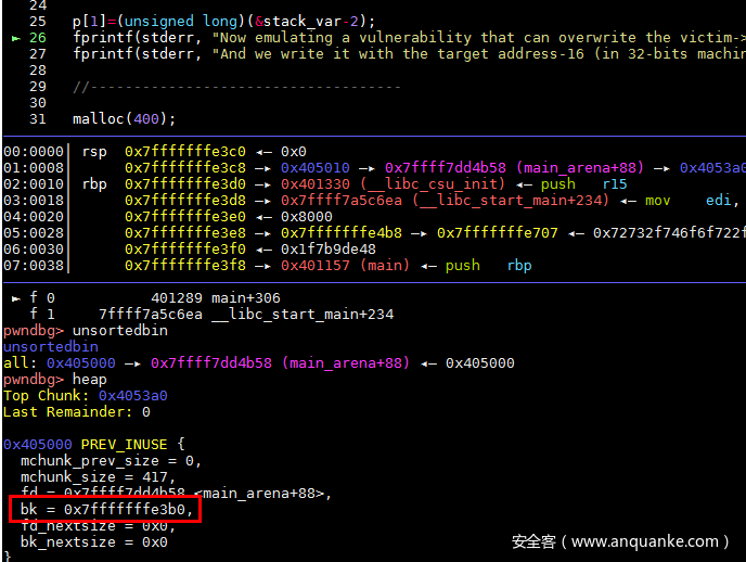 FD->bk = BK (这个是导致unsorted bin之后申请的内存为栈地址)