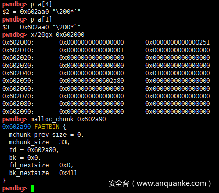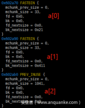 再按顺序释放a[0]、a[2]、a[1],然后再申请一次a[3]=malloc(16)