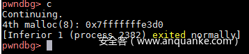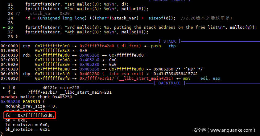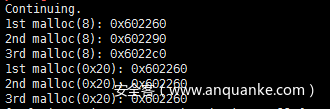 fprintf(stderr, "2nd malloc(8): %pn", malloc(8));//这一句glibc-2.26中也可以删除的,不删除也无所谓,不修改fd指针之前,是循环返回a的地址。