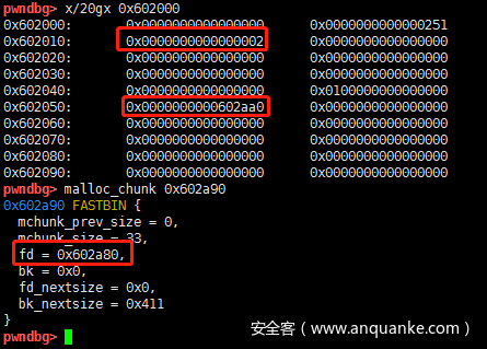 a对应chunk(0x602250)中fd指针是指向自己的地址的