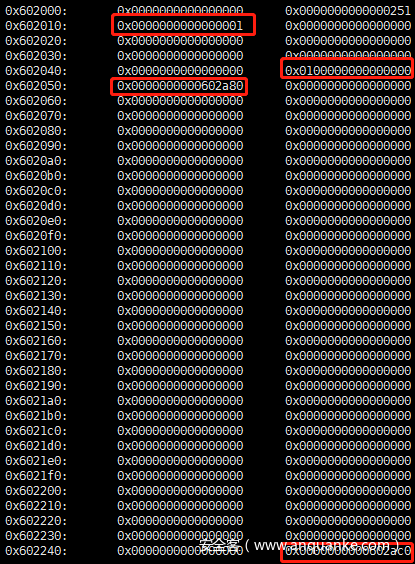 现在释放a[0]和a[2],tcache也是申请的一块堆内存上存放的,因此查看申请的第一块内存的数据,tcache的chunk是从0x602000开始的,前16字节是chunk头,之后的64字节是count数组,用来记录对应下标链表的个数,之后的每8个字节是一个链表,总体是链表数组,长度是64。count数组的最低位和最高位分别记数了1,链表里存放的是a[0]和a[2]的fd指针的地址。