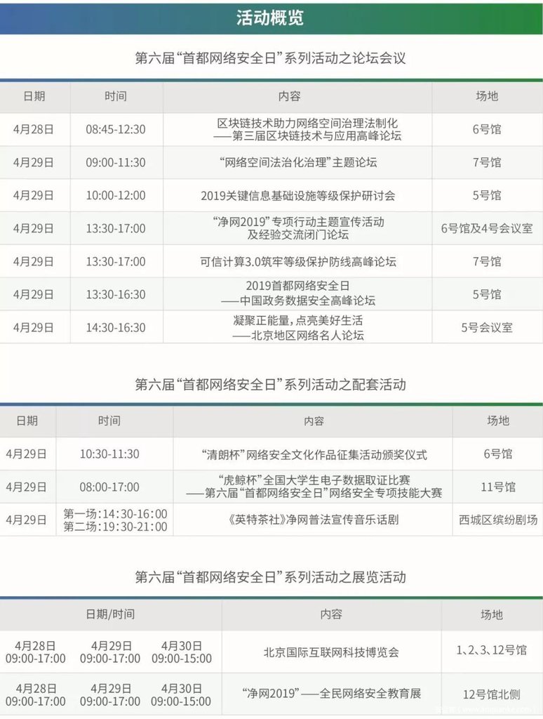 本次活动,除了邀请到众多明星展商外,同期举办的多场网络安全主题高峰论坛,将围绕着网络空间法治化治理、区块链技术、关键信息基础设施等级保护、等级保护、政务数据安全等内容进行深入交流探讨,同时还将举办教育展、网络安全技术大赛、网络安全文化作品展示等精彩活动。