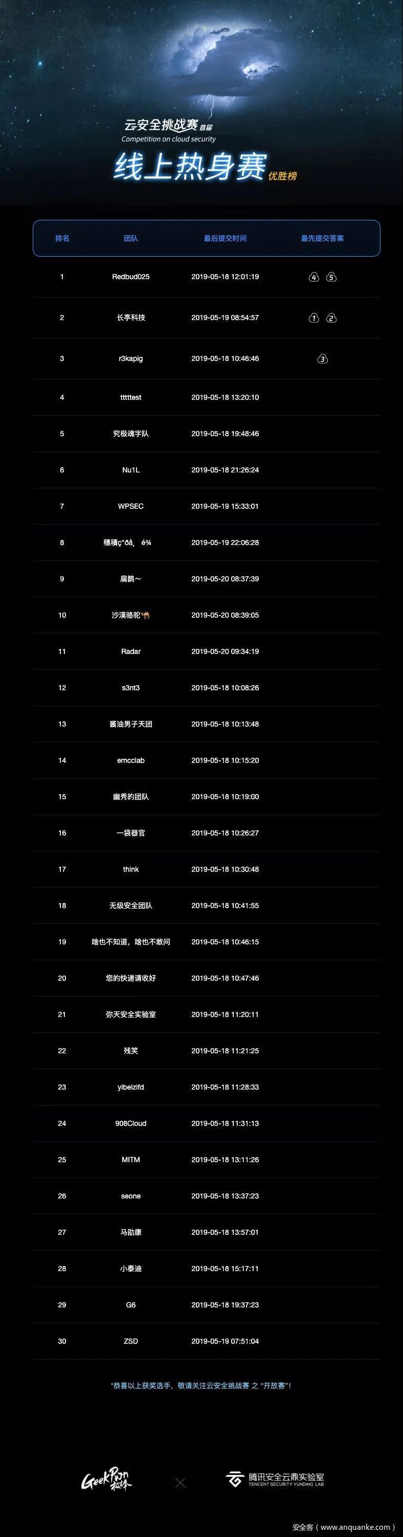 经过48个小时的鏖战,和组委赛后的验证与评选,GeekPwn云安全挑战赛第一阶段线上热身赛的比赛结果出来啦~