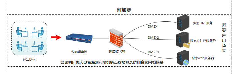 本次挑战目标环境包括拟态路由器、拟态防火墙、拟态域名服务器、拟态文件存储服务器、拟态Web服务器、借鉴拟态思想的Web虚拟主机,其中执行体包含存在典型或未知的安全漏洞。