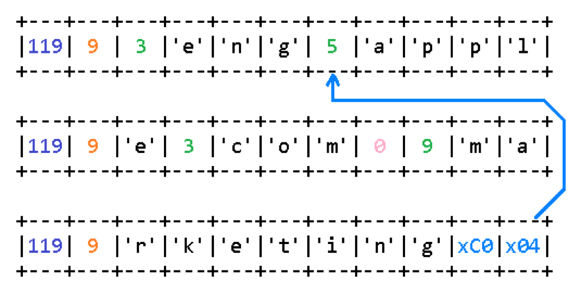 上图来自RFC 3397中的一个示例,相关数据被分成3块,每块数据大小为9字节。如上图所示,各个子域名开头为子域名所占大小(1字节),随后是子域名字符串。完整域名以null字节作为结尾符。