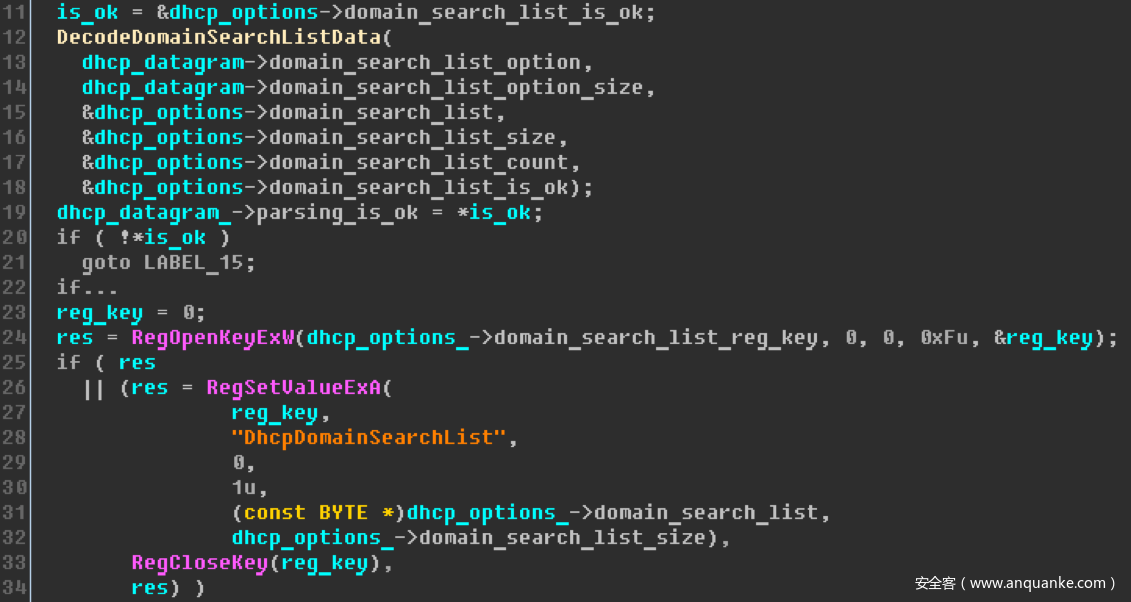 实际上,微软只在1个函数上做了或多或少的改动:DecodeDomainSearchListData。如果大家对DHCP协议及相关函数非常熟悉,那么应该知道该函数负责处理哪个列表。如果不熟悉,我们可以来分析一下这个协议。