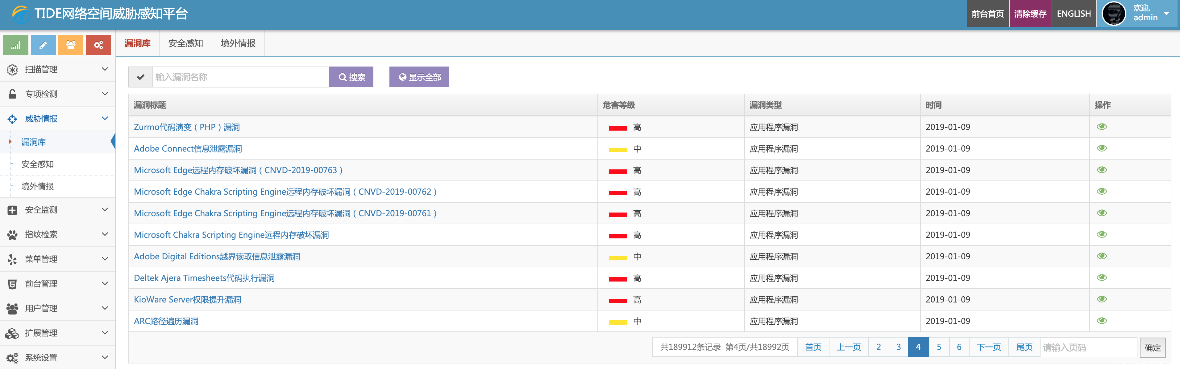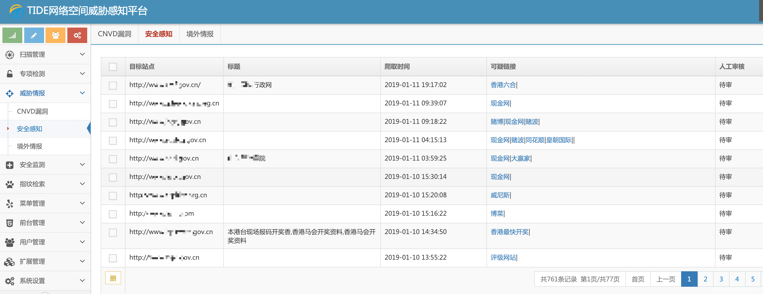 说是威胁情报,其实就是一堆漏洞库和安全监测的数据,主要搜集爬取各公开漏洞库并进行整理,对重点客户常态监测暗链、敏感字等情况,另外添加了fangong黑客的监测,很鸡肋的一个功能。