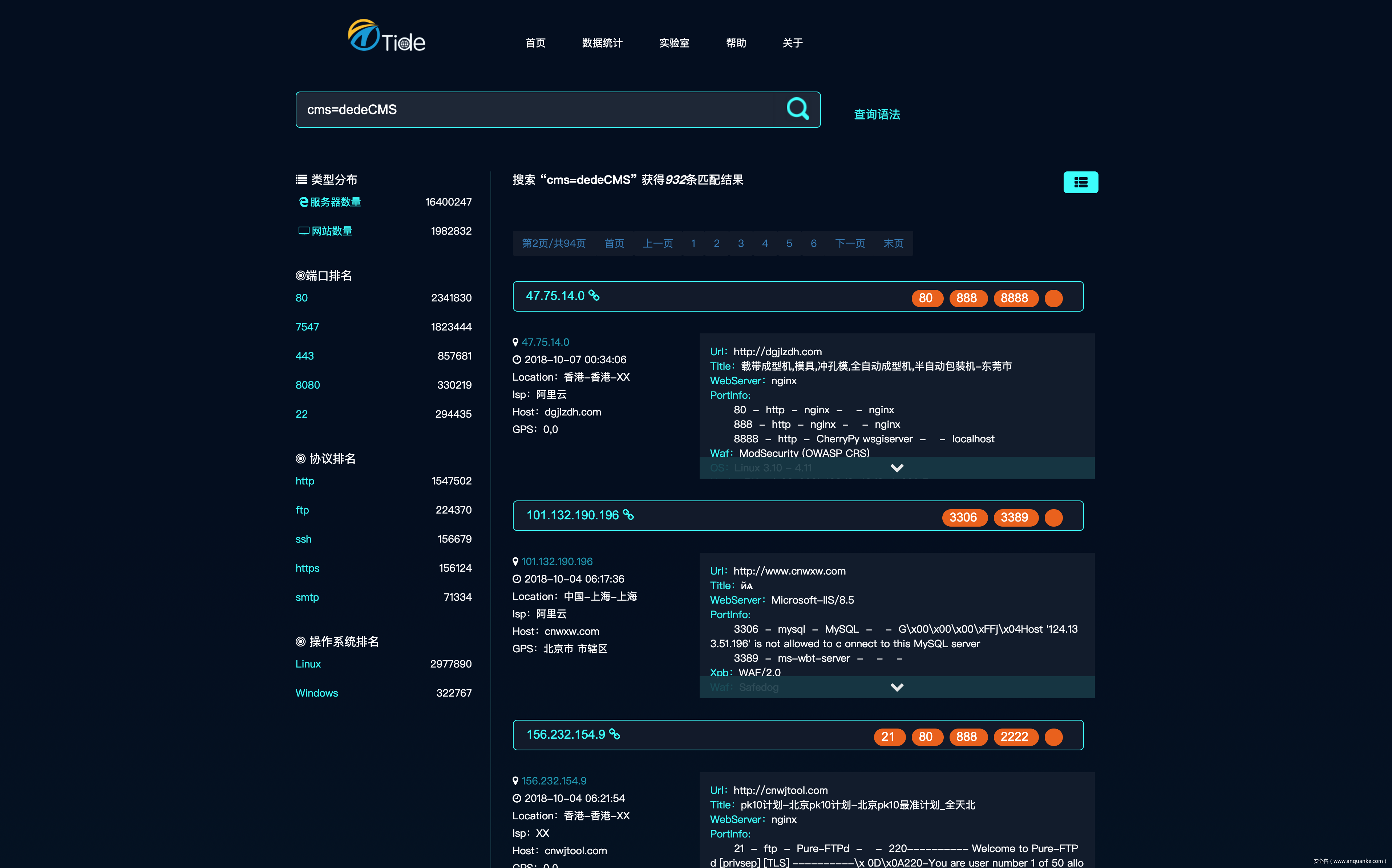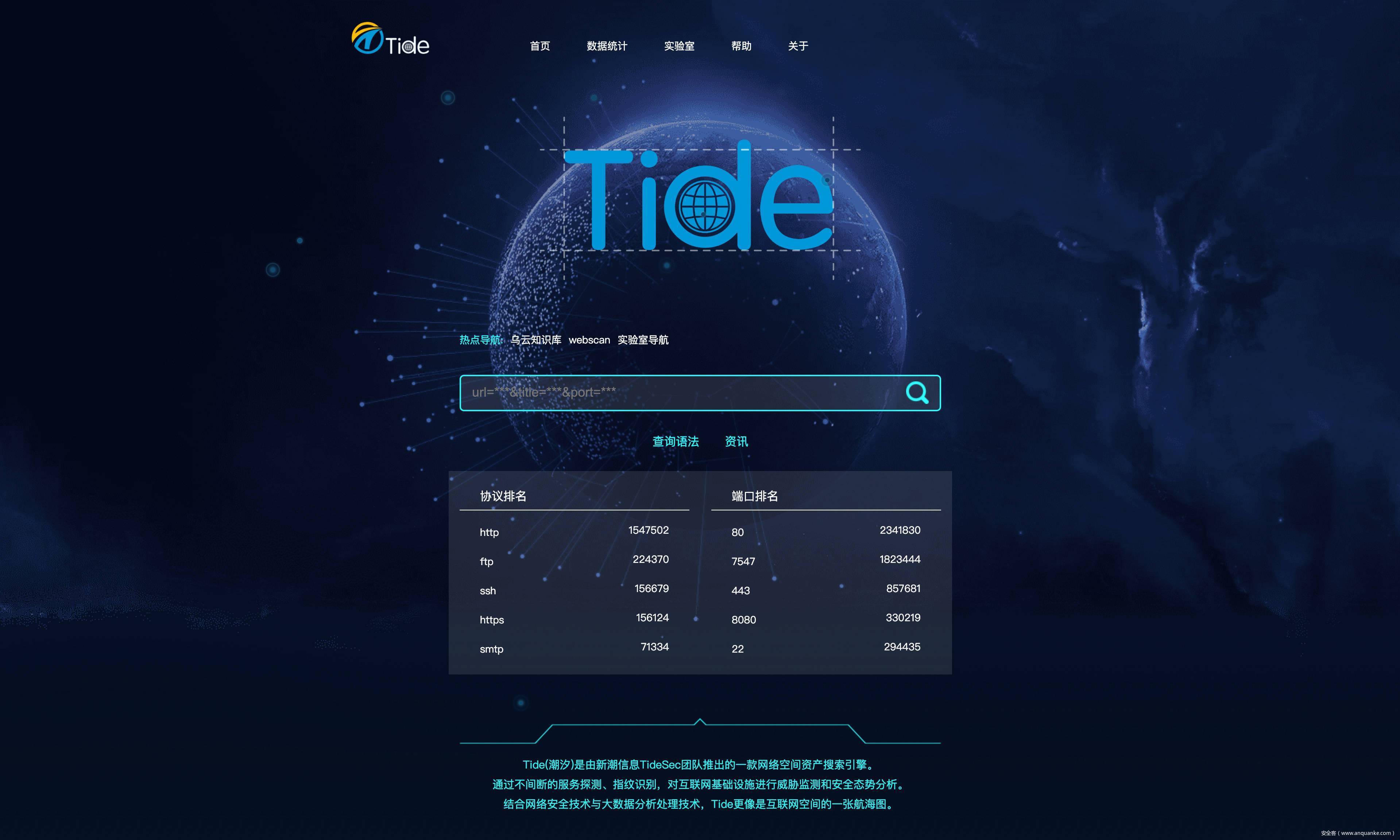 Tide(潮汐)是由新潮信息TideSec团队推出的一款网络空间资产搜索引擎。通过不间断的服务探测、指纹识别,对互联网基础设施进行威胁监测和安全态势分析。结合网络安全技术与大数据分析处理技术,Tide更像是互联网空间的一张航海图。