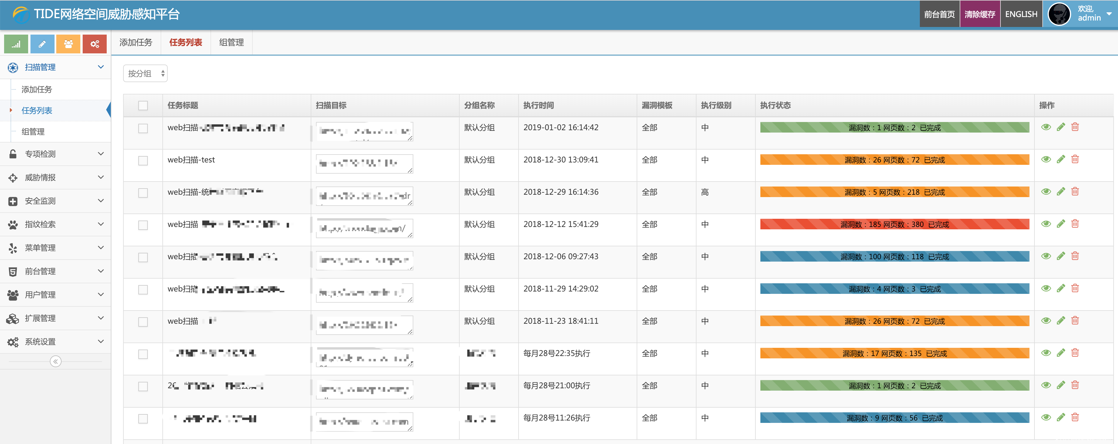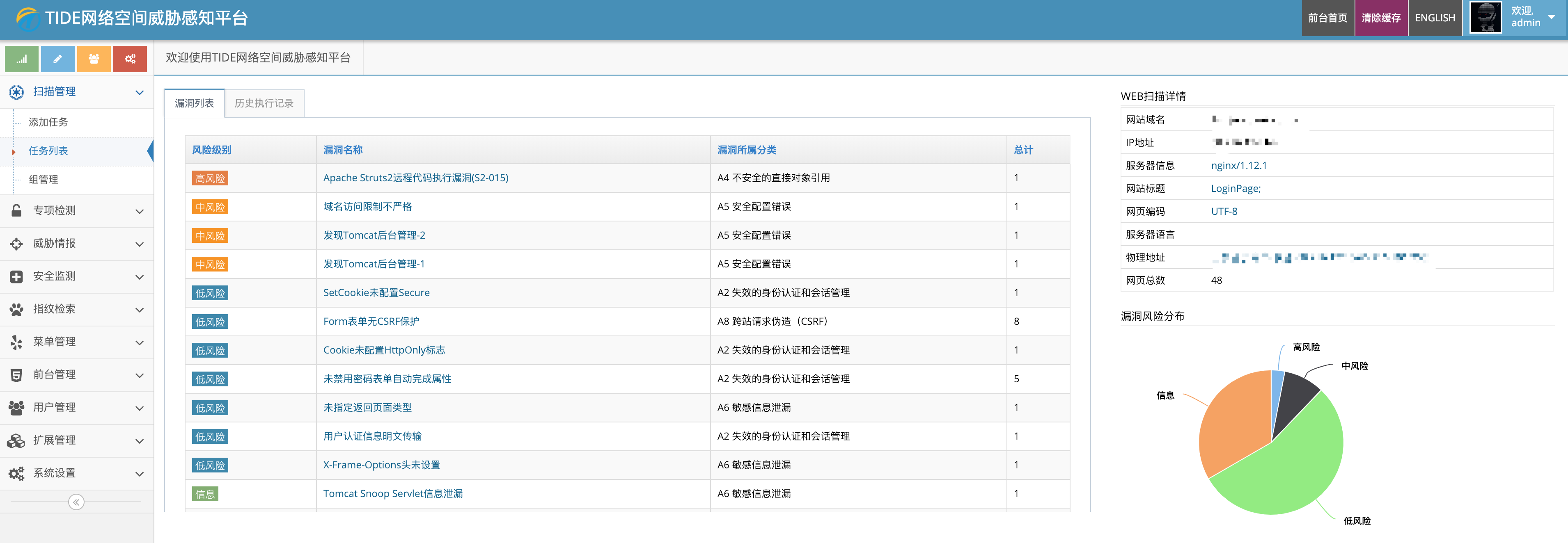 Tide(潮汐)目前实现了网络空间资产探测、指纹检索、漏洞检测、漏洞全生命周期管理、poc定向检测、暗链检测、挂马监测、敏感字检测、DNS监测、网站可用性监测、漏洞库管理、安全预警等~