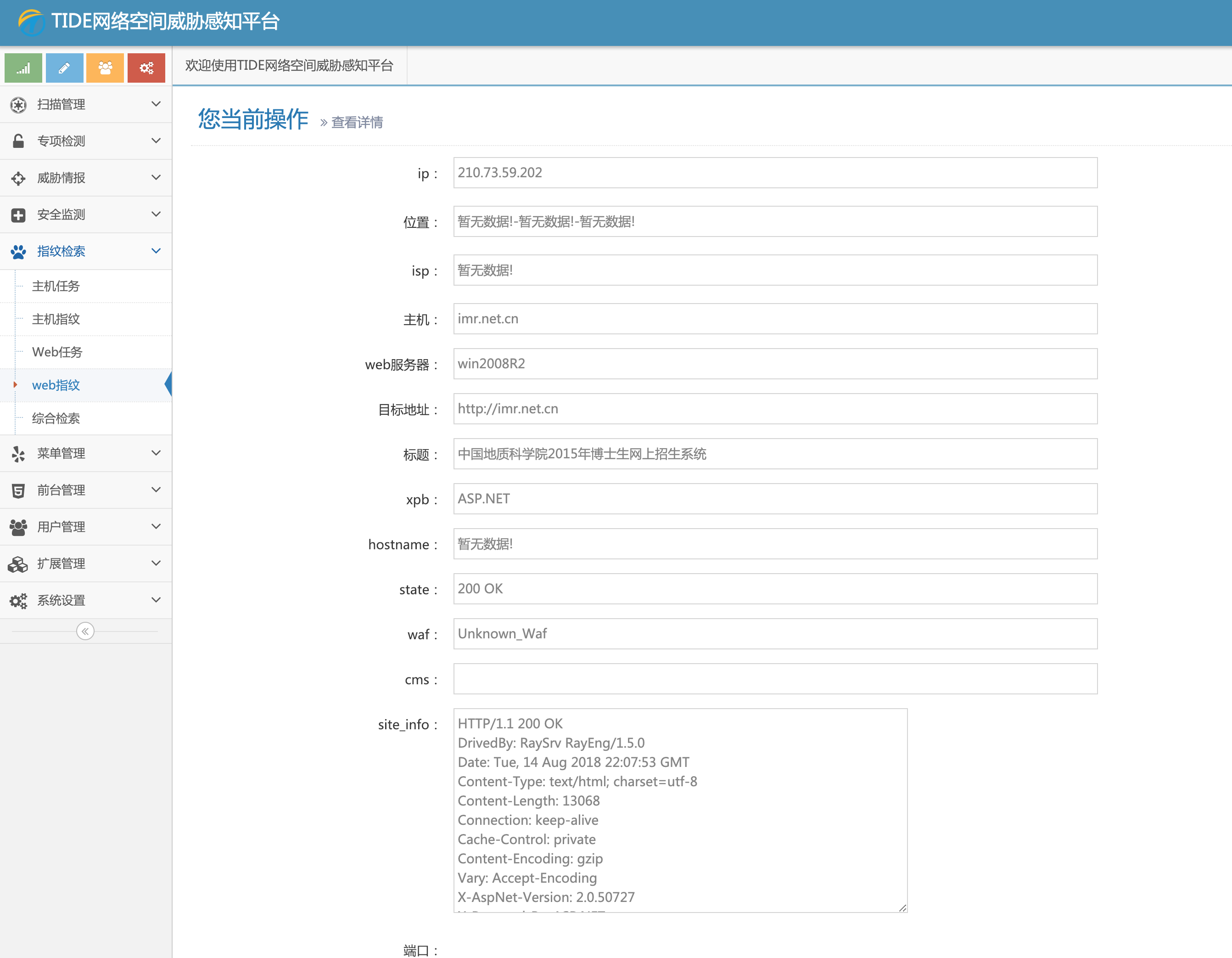 资产的详细信息:url、ip、标题、端口、端口服务、服务版本号、cms信息、操作系统信息、web中间件信息、waf信息、xpb信息、ip地址信息等等