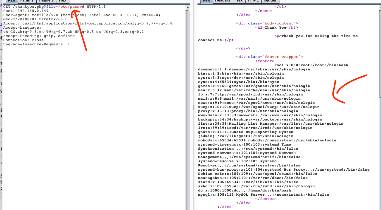 应该是使用php的 ‘include()’ 函数来包含了 ‘footer.php’ 文件,这样直接导致了LFI漏洞,下面我们来测试一下漏洞是否真的存在和看一下是否会过滤包含进来的文件,