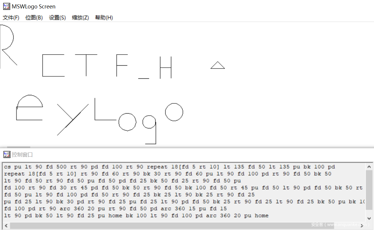 根据题目提示,搜索部分代码,返回LOGO语言,下载PC logo语言编译工具,将题目给出命令语句导入编辑器,画出图像,结合题目正则最后得出flag:RCTF_Hey_Logo