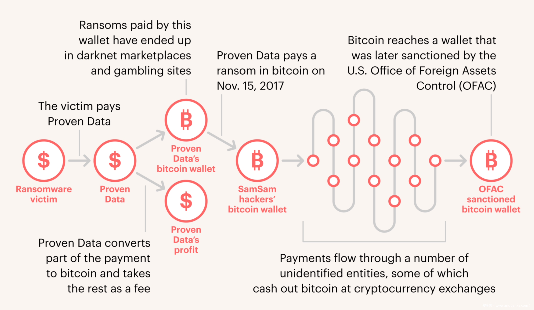 尽管比特币的最大“噱头”就是其交易匿名性且难以追踪,但我们还是追踪到了四笔相关的支付款项。根据比特币追踪公司ChainAnalysis提供的分析报告,该公司在2017年至2018年间,从他们的在线钱包多次给攻击者指定的钱包地址支付过比特币,而且还使用了多达12个不同的比特币地址进行洗钱活动,最终到达伊朗黑客的手上。有关人士认为,如果勒索软件是在给恐怖主义或网络犯罪组织提供金钱资助的话,那合法的安全技术公司也在做同样的事情,这不是太可怕了吗?